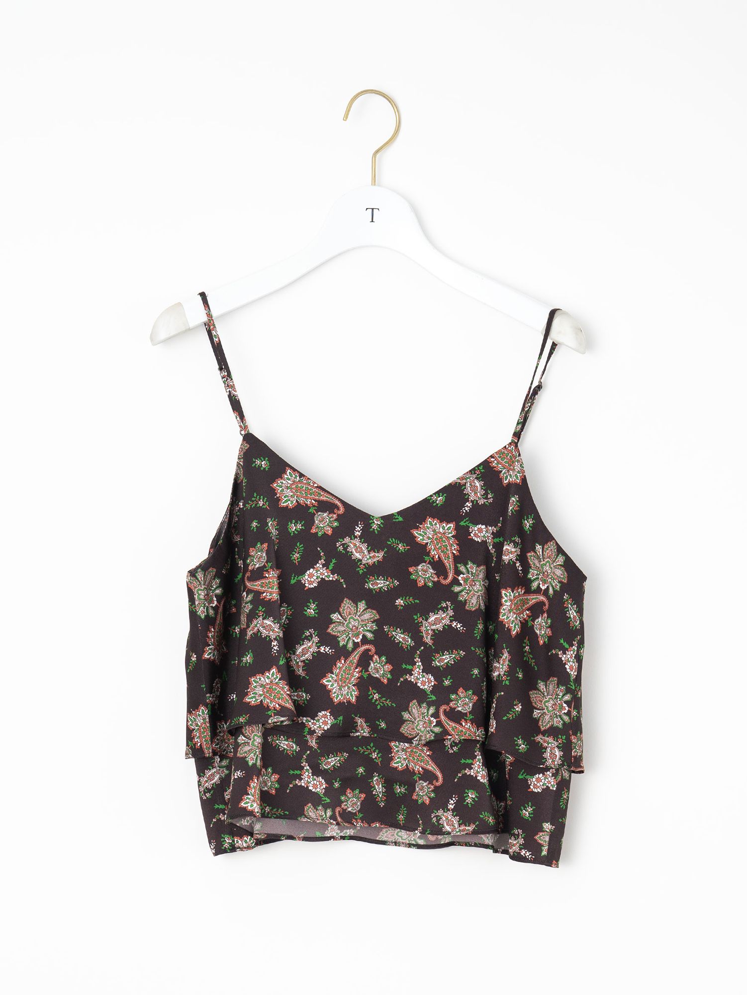 Tシャツと合わせたり、同素材で展開しているパンツとセットでコンビネゾンのように着ていただくのもとても素敵です。前後どちらも楽しめる2wayデザインが嬉しい1枚です。上品なとろみのあるドレープ感と桃のような肌触りとしなやかな柔らかさを持った素材です。アート感漂うペイズリー柄は、モチーフのバランスや線の細さ、色や配置のバランスなどにこだわって作成した美しい柄です。。ベースカラーのダークブラウンがトレンド感も演出しつつ、リラックス感と華やかさが共存すペイズリー柄です。