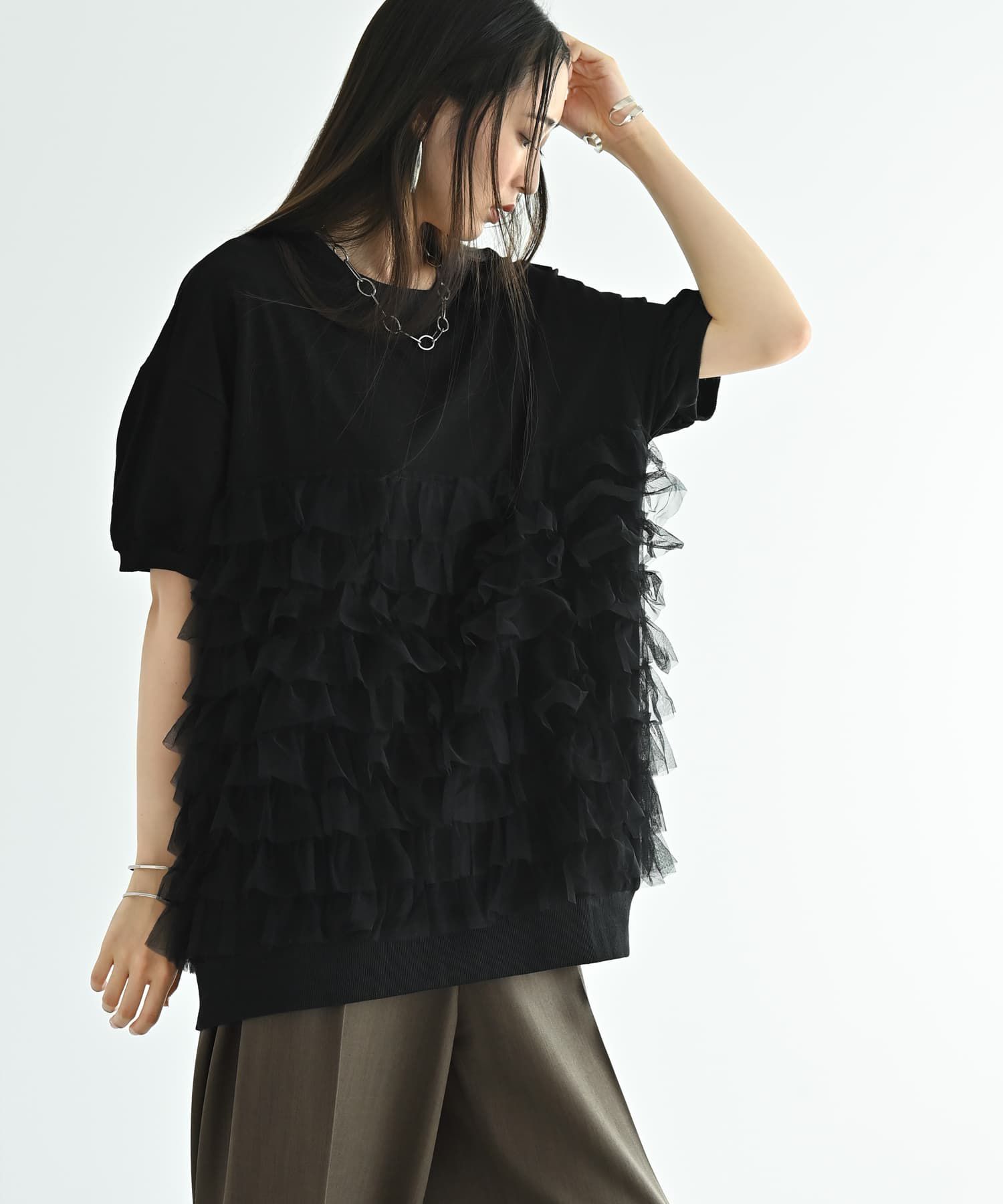 フロントに贅沢に重ねたチュールが印象的な、大人のためのレイヤードスウェット。シンプルなスウェットに立体感を与え、1枚で着ても羽織のインナーとしても華やかに映えます。特に羽織の下からチュールがのぞくスタイルは、コーディネートにアクセントを加え、さりげなくおしゃれ度を引き上げてくれます。身幅・肩幅ともにゆとりのある設計で、肩幅がしっかりめの方やLサイズ以上の方でも安心。着丈は長めで、高身長の方でもバランス良く決まり、ヒップまで自然にカバー。日中は一枚でさらりと、朝晩や季節の変わり目は羽織アイテムのインナーとして、ロングシーズン活躍します。【こんな方におすすめ】・シンプルなトップスに華やかさをプラスしたい方・肩幅やバストにゆとりが欲しい方・高身長で着丈が足りないと感じやすい方・羽織のインナーにも映えるデザインを探している方【商品について】・ゆったりシルエットで体型を選ばない・長めの着丈でヒップまでしっかりカバー・フロントのチュールデザインが華やかさをプラス・伸縮性やや有りで快適な着心地【素材について】・本体:綿75%、ポリエステル25%(柔らかく程よい厚み)・別布:ポリエステル100%(軽やかなチュール)・裏地なし/透け感なし・手洗い可能でお手入れ簡単【おすすめコーディネート】・ワイドパンツと合わせてモードな大人カジュアルに・ロングスカートで甘辛ミックスのスタイルに・ジャケットやカーディガンのインナーに差し込み、チュールをちらりと見せて華やかに【商品の詳細】◆着用時期:夏以外、冬は重ね着で着用可能◆サイズ感:重ね着しても窮屈感なし◆着丈:74.5cm(ヒップをしっかりカバー)◆厚み:中肉でオールシーズン使いやすい◆柔らかさ:程よくしっかりとした風合い◆光沢感:なし(マットな質感)◆伸縮性:あり(快適な着心地)◆裏地:なし◆洗濯:手洗い可能・低温アイロン可【お色について】ブラック:深みのあるシックなブラックに、同色のチュールを重ねて奥行きをプラス。透け感のあるチュールが光を含み、重たくならずモードな印象を引き立てます。グレー:杢調のライトグレーに、ほんのり透明感を帯びたグレーチュールを重ねた上品なカラー。軽やかでニュアンスのあるトーンが、女性らしい柔らかさを演出します。