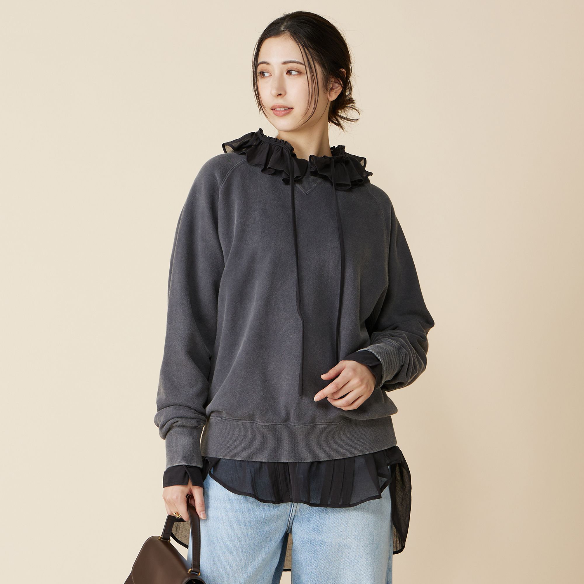 ネック〜ショルダーの切り替え、袖口、裾にはローゲージで編んだニットのようなカットソー素材を使用しています。身頃はドライタッチで膨らみのある裏毛を使用。袖にはさりげない裏使いの切り替えがあり、細かいデザインが効いています。 シンプルなコーディネートのアクセントに取り入れて欲しい1着です。