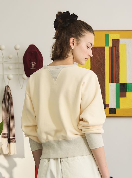 こちらは丸どうボディでクルーネックスエットをヴィンテージライクに作った一品。前後についたガゼットが特徴的なデザインになっています。ボディはアイボリーでリブをライトグレーで少し配色にしています。