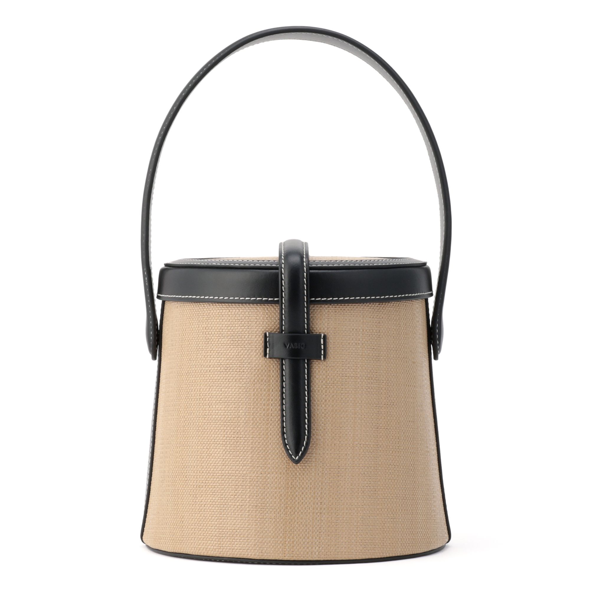 かっちりとした筒型やレザーとのコンビで、都会的に仕上げたラフィア調のかごバッグ。マチも高さもあるので収納力にすぐれ、ふたつきで中身が飛び出しにくいのも使いやすさの理由に。ハンドル部分は前後に倒れる回転式で、物の出し入れもスムーズ。ボックスタイプのハンドバッグ「Franca(フランカ)」。ラフィア調素材のナチュラルな風合いを用いながら、あくまで都会的なニュアンスを意識したバッグです。丸い筒形のフォルムは収納力に優れ、太めのハンドルが回転式なので、物の出し入れをスムーズに行うことができます。