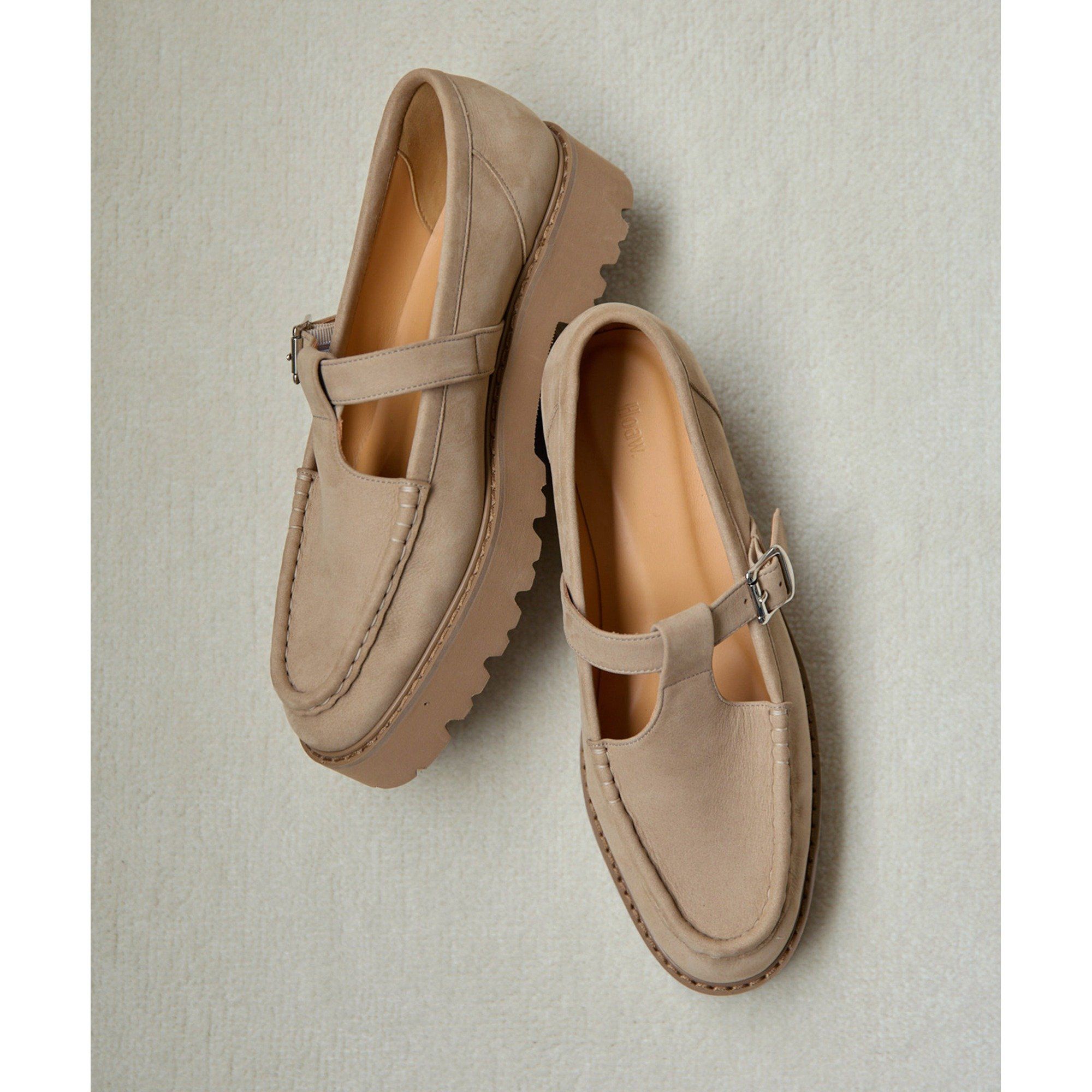 【2025AW】モダンな足元を演出する、大人のTストラップローファー■クラシカルなTストラップデザインに、モダンなボリュームソールを融合させたローファー。■アッパーにあしらわれたモカ縫いステッチに、熟練の職人が一針一針丁寧に仕上げた手仕事の美しさが光る一足。■タフなラグソールは歩行性にも優れ、スタイルアップと実用性を両立。■マニッシュにもフェミニンにも振れるデザインで、シーズンレスに活躍する万能アイテム。【COLOR】ベージュ:足元に上品に馴染む柔らかなベージュ。ブラック:洗練された印象に仕上がるブラック。【MATERIAL】ベージュ:柔らかな風合いとマットな質感が魅力のヌバックレザー。ブラック:上品な艶感としなやかさを兼ね備えたスムースレザー。― Hoaw.(ハァウ) ―日常にプラスするちょっとしたエッセンスその日の気分で…気負いなく、遊びの利いたムードをプラス気分はなやぐアクセサリー 季節になじむバッグ 足元を固めるシューズそれぞれの役割が重なって完成するファッション洒落の効いたファッションを楽しむ大人の女性へ向けて提案【注意事項】・画像の商品はサンプルです。実際の商品と仕様、加工が若干異なる場合があります。また 、パソコンやスマートフォンのモニター環境などにより、色味が違って見える場合がございます。・店頭及び屋外での撮影画像は、光の当たり具合で色味が違って見える場合があります。商品の色味は、スタジオ撮影の画像をご参照ください。・入荷状況により、お届け予定が前後する場合があります。・お客様への発送が店頭販売より遅れる場合があります。・追加生産商品は、一部の店舗、通販で販売中の場合があります。予めご了承下さい。