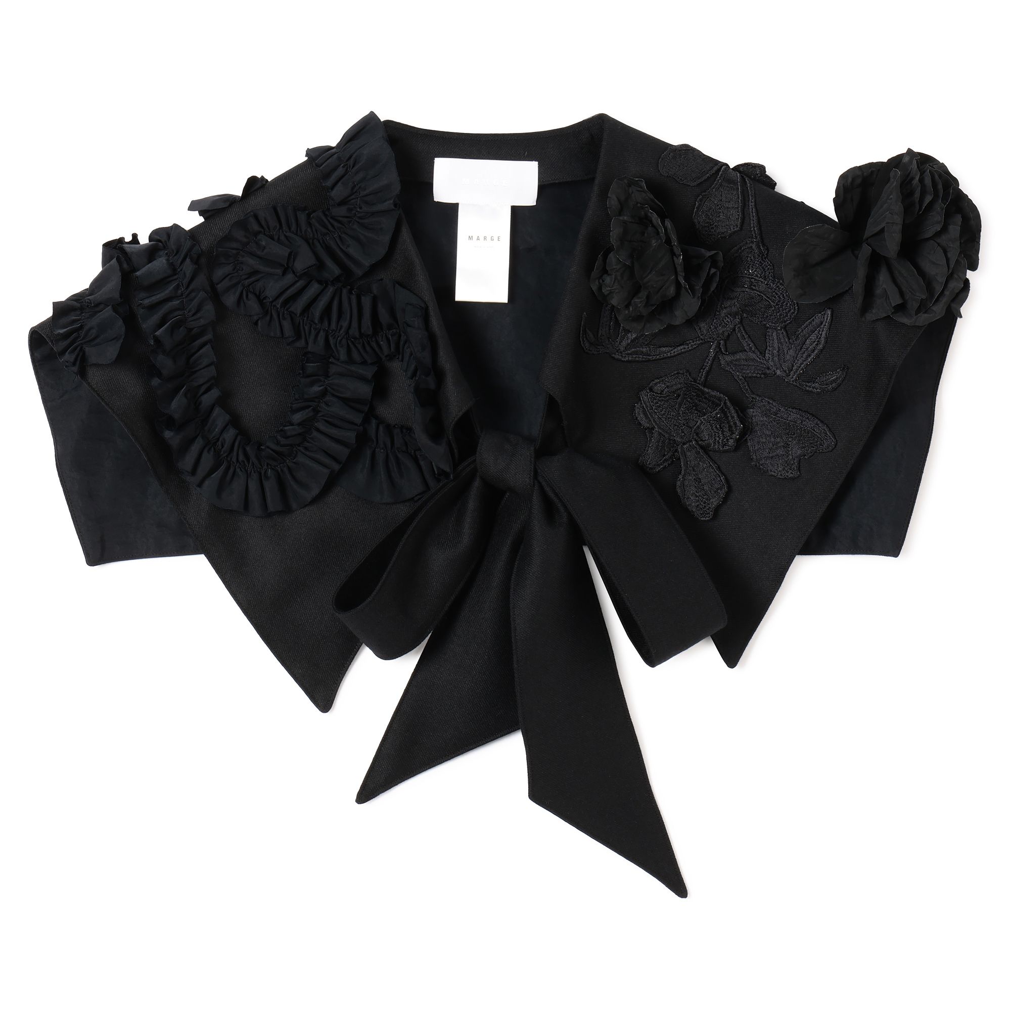 花モチーフ、ギャザーフリル、刺繍と「MARGE」らしいアクセントが光る付け襟。バックはすっきりとしたセーラーカラー風のデザインなので馴染みやすく、重ねるだけで今季を反映。しなやかウールで落ち着いた感じにまとまり、大人の愛さしさをアピールできます。