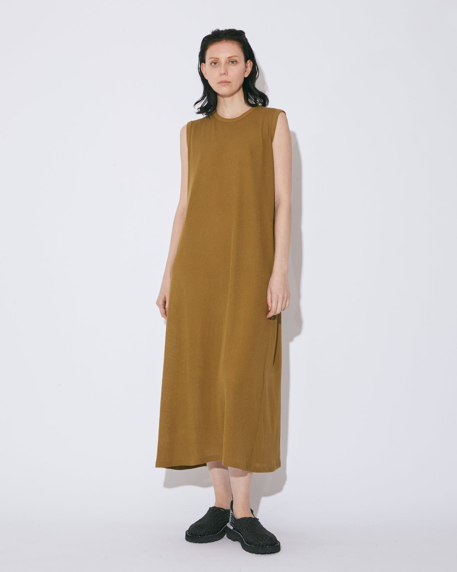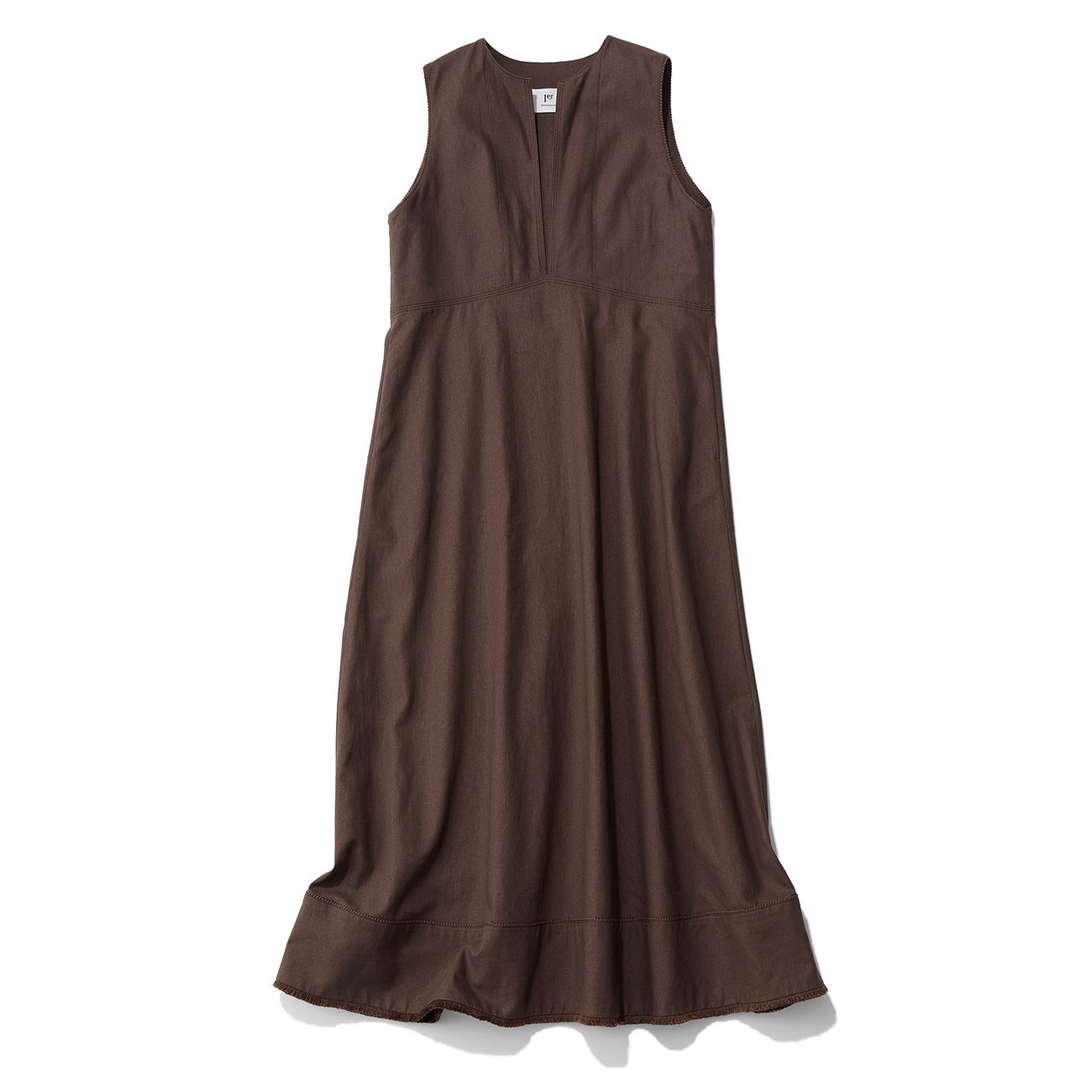 浮かびあがる凹凸感が特徴の、スビンコットンのノースリーブドレス。肉感を拾いにくい直線シルエットで、バックの衿下にあしらったロゴ刺繍がポイント。さっと着るだけで力の抜けたリラクシーな雰囲気に導き、一層今季らしいムードに。