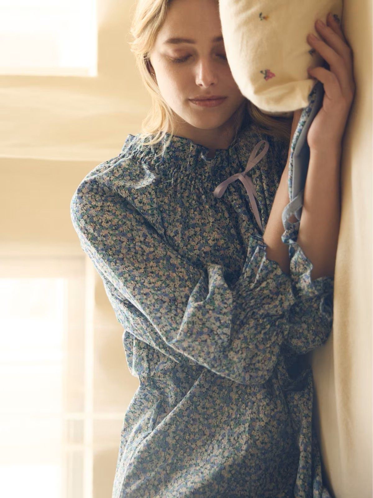 ゆったりとしたシルエットにパフスリーブがフェミニンな印象のチェリーブロッサムドレスに新柄が登場。こんぺいとうのようなポップで丸みのある小花が愛らしい、HOKKOH MADE WITH LIBERTY FABRICのオーガニックローン生地のチェリーブロッサムドレスです。薄く、軽い布帛の生地はさらりとした肌ざわり。春から秋ごろにかけて長い間着ることができます。首元はゴムとリボンで、すぼめたり広げたり、お好みの開き具合の調節が可能です。袖口にもゴムがはいっているので、袖の長さも調節しやすく、家事やスキンケアの際にも邪魔にならない実用性を兼ね備えています。■オーガニックコットンのやさしさ、HOKKOH × LIBERTYの美しさ繊細なプリントと上質な風合いで知られるLIBERTY FABRIC。その美しい世界観を、日本の老舗テキスタイルメーカー〈HOKKOH(北高)〉が厳選したオーガニックコットンにのせて仕立てました。この生地に使われているのは、環境にも人にもやさしい「トゥルーコットン」。農場から紡績工場まで一貫して管理されているため、生産者の顔が見える安心安全な素材です。LIBERTYならではの洗練されたプリントを、ナチュラルな素材感とともに楽しめる特別なファブリック。サステナブルでありながら、ファッション性も妥協しない、心地よさと美しさを兼ね備えた1枚です。■マタニティ期にもおすすめゆったりワイドな身幅と大きく開くことができる首元から、マタニティ期にもおすすめのドレスです。着やすく、脱ぎやすい。短めのチュニックのような丈感で体型もカバーしてくれるのがうれしいポイント。