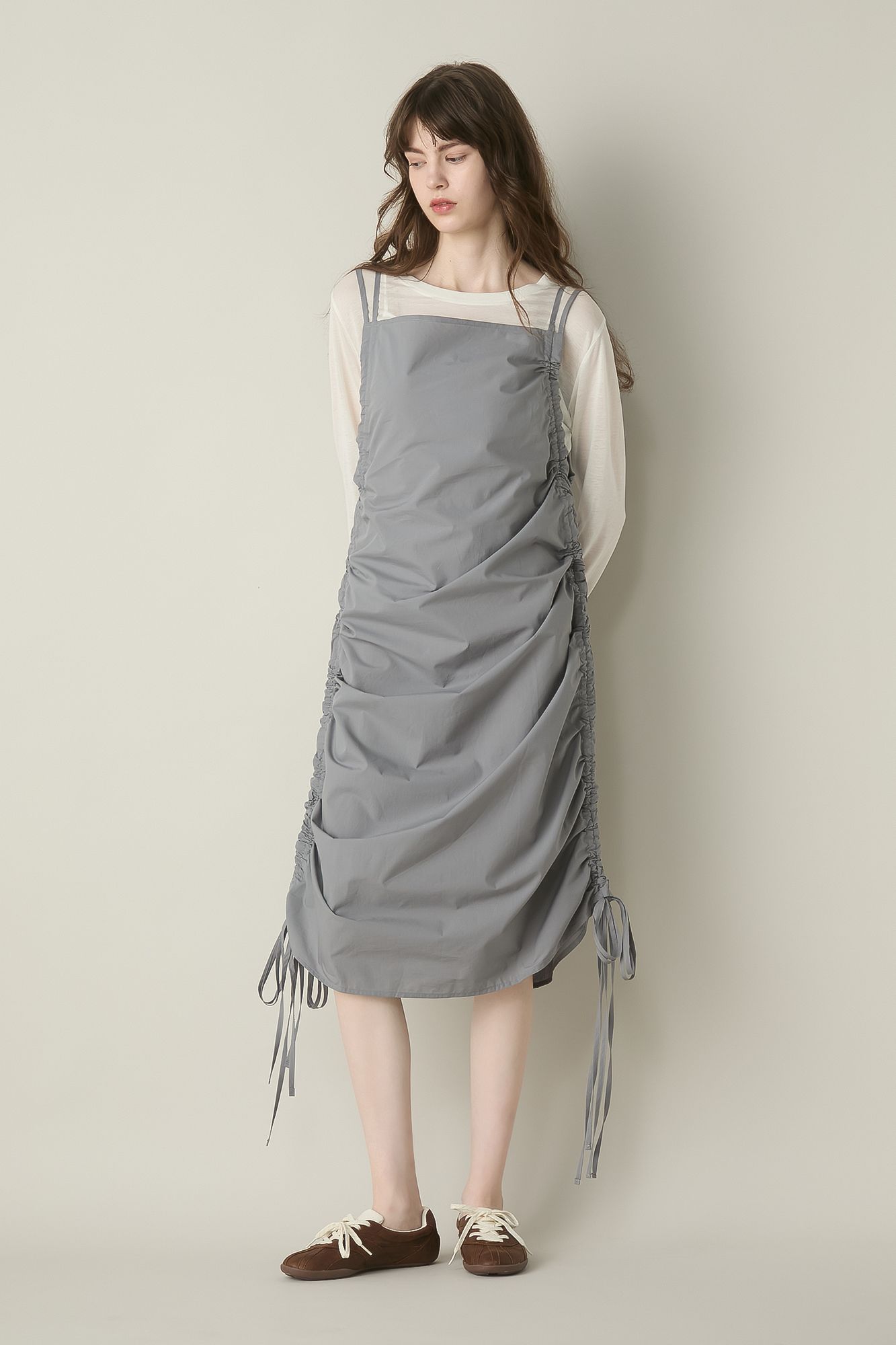 直線的なネックラインが新鮮な、ストラップドレス。ドローコードは垂らしたり、結んだりと視覚効果抜群!コードの調整で着丈バランスも一気に変化し、同シリーズのトップスやパンツともレイヤードしがいのあるアイテムです。