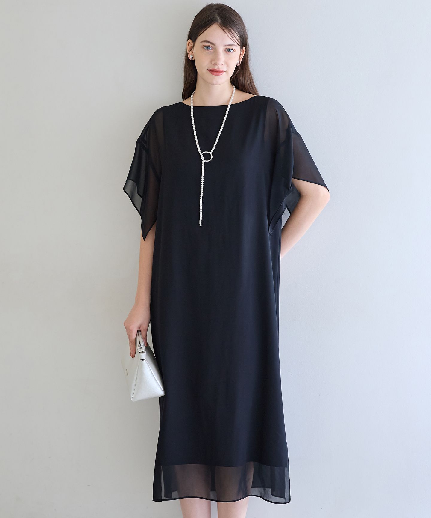 2025 AutumnAPPLAUDIR(アプロディール)APPLAUDIR(アプロディール)とは、フランス語で『喝采する・喜ぶ』という意味。結婚式やパーティなど、華やかなシーンにぴったりのAPPLAUDIR (アプロディール)シリーズです。■デザインシアーな素材を使ったシンプルなドレスと別布ベルトをセットにした着回しを楽しめるデザインドレス。袖はハンカチーフヘムにすることでシンプルながら動きのあるデザイン。さりげなく気になる二の腕もカバーします。 1枚でさらりと着用してもシルエットが美しく、またお好みで着脱可能の別布ベルトでシルエットや雰囲気を変えてもお楽しみいただけます。カラーは、清楚な気品が漂う黒色に近いネイビー(#075)、シックな雰囲気を引き立てるブラック(#005)の2色展開です。■素材説明本体シアー:75デニールのポリエステルを使用したシフォンジョーゼット素材です。表面は繊細なシボと落ち感があり、やわらかく美しいドレープが出る風合いが特徴です。別布ベルト部分:柔らかな肌触りと適度な伸縮性が魅力のバックサテンジョーゼット素材を使用しています。裏面がサテンのため裏地なしでも肌触りがよく、シワになりにくいのが特徴です。ご自宅で手洗いができるのも嬉しいポイントです。※画像はサンプルを使用している為、実際にお届けする商品と仕様が異なる場合がございます。※サンプルはモデルサイズを使用している為、実際の商品のサイズはサイズ詳細の実測をご参照ください。※撮影環境の都合上、実際の商品と色味が異なって見える場合がございます。商品の色味はハンガーの商品詳細画像をご参照ください。
