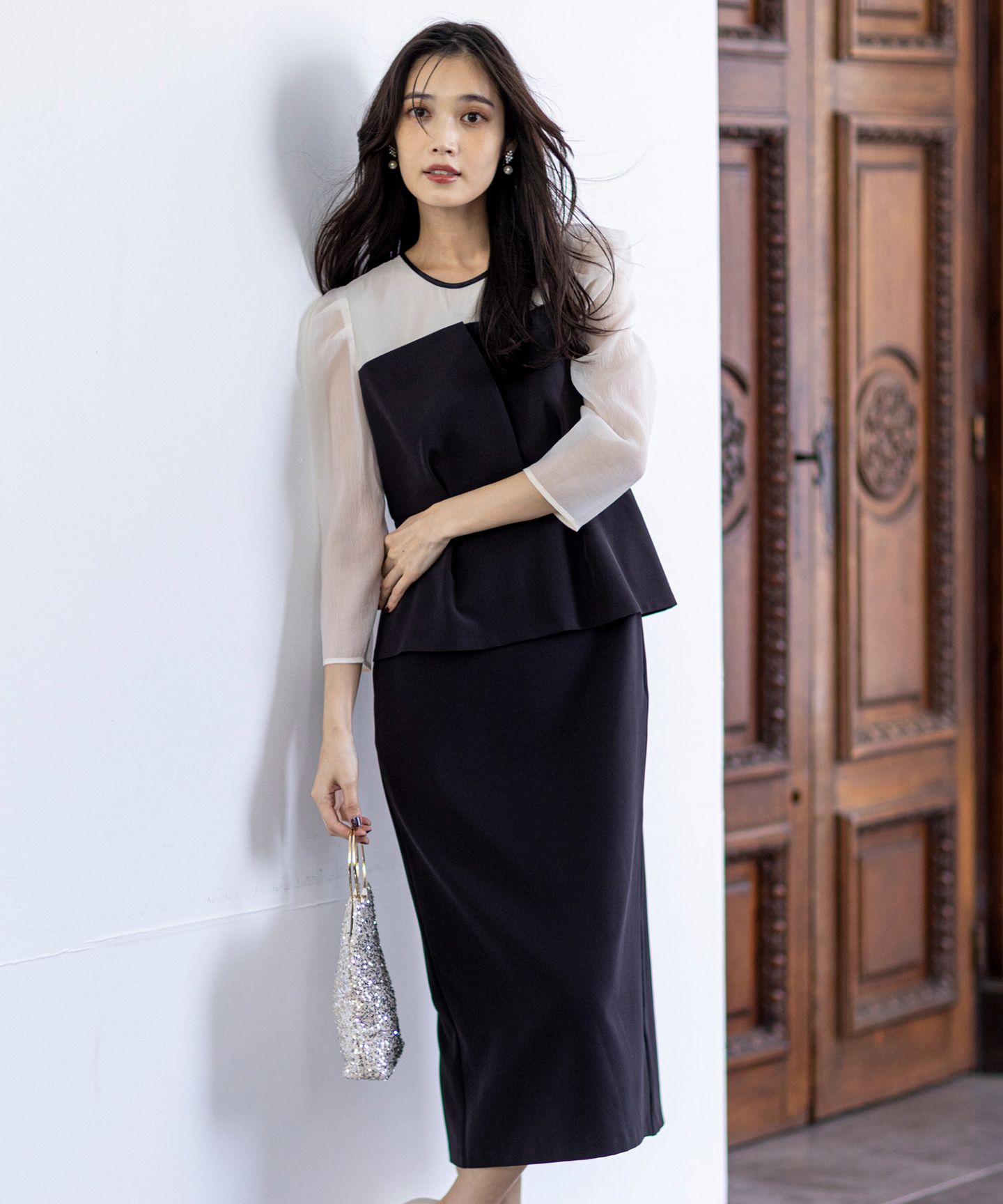 ペプラム×バイカラーで魅せる大人の高見えドレス■デザイン・人気のペプラムディテールとバイカラー別布使いが高見えする、大人シルエットのドレス・デザイン性がありつつ、機能面も充実・ペプラムは前はすっきり、後ろは位置を下げてヒップをカバーできる丈感・スカート部分はペンシルシルエットですっきり見え、後ろベント入りで足さばきも良好・深めのベントには持ち出し付きで、足が見えすぎる心配もなし・ヨーク見返しにはシフォンを使用し、肩ヒモが透けにくい仕様■仕様・後ろファスナー開き・ゴム入り・上身頃のみ裏地付き(スカート部分は裏地なし)■素材・適度なふくらみとしなやかさのある中肉のダブルクロスを使用・表情豊かなダブルクロス素材で、裏地なしでも安心して着用可能・きれいな表面感と優れたストレッチ性、肌あたりの優しい素材感が魅力※色によって別布のシボ感に個体差があります。素材の特性をお楽しみください。※商品画像はサンプルを使用しているため、色味やサイズ等の仕様に変更がある場合がございますので、予めご了承ください。※屋外での撮影画像は、光の加減で色味が違って見える場合がございます。商品の色味はスタジオ撮影の画像をご参照ください。#anySiS #エニシス #エニィシス #レディース #ドレス #ワンピース #ペプラムドレス #バイカラーデザイン #高見えコーデ #ストレッチ素材 #きれいめ #きれいめコーデ #大人レディ #フェミニン #レディスタイル #カジュアル #きれいめカジュアル #お出かけコーデ #お呼ばれ #結婚式 #パーティ #参列コーデ