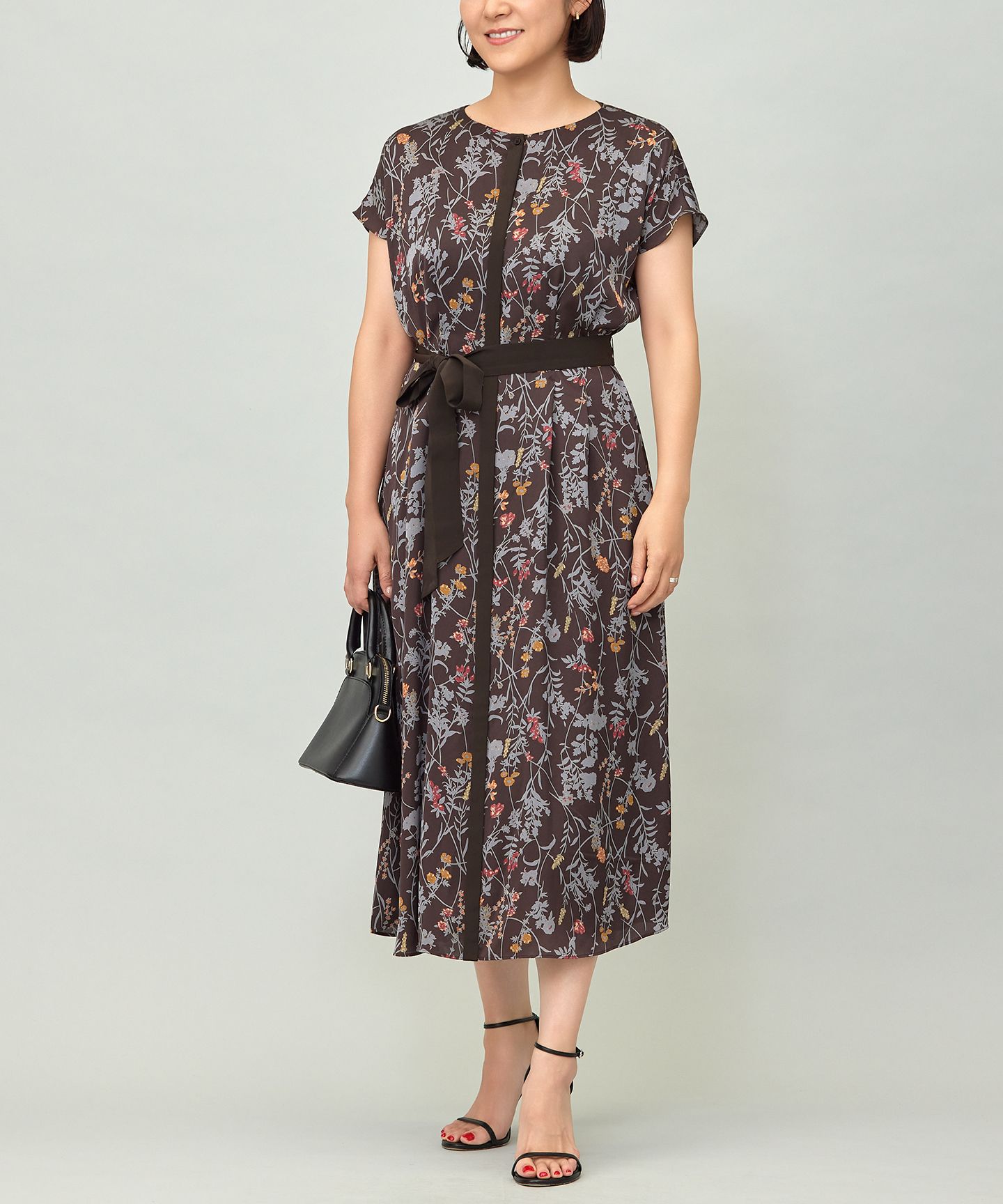 自由区オリジナルの柄プリントが華やかなワンピース■デザインしなやかなサテンジョーゼットの落ち感が女性らしい、ノーカラーのシャツワンピースです。ウエストにダーツとタックを入れつつ、程よいゆとりを持たせたゆったりとした着心地でありながら、すっきりとしたきれいなシルエットが魅力です。共のベルトでウエストマークして、よりきちんとしたコーディネートも可能です。前立ては比翼開きですが、ヒップラインから下は開かないデザインなので裾周りを気にせずに着て頂けます。ジャケットやカーディガンに合わせて通勤からデイリーまで活躍するワンピースです。■素材ポリエステルのしなやかなサテンジョーゼットに、ハーブの花をモチーフにした自由区オリジナル柄をプリントしました。縦に流れるような植物柄が大人っぽく、サテンジョーゼットの美しいドレープ性も相まって、華やかで大人っぽいプリント素材です。シワにもなりにくい点も魅力です。ネイビー系(075)は無地になります。■同素材アイテムスカート(SKWMSM0415)※生産時期により原産国が異なります。予めご了承ください。※モデル画像はサンプルを使用している為、実際にお届けする商品と仕様、加工、サイズが若干異なる場合がございます。予めご了承ください。※撮影環境の都合上、実際の商品と色味が異なって見える場合がございます。
