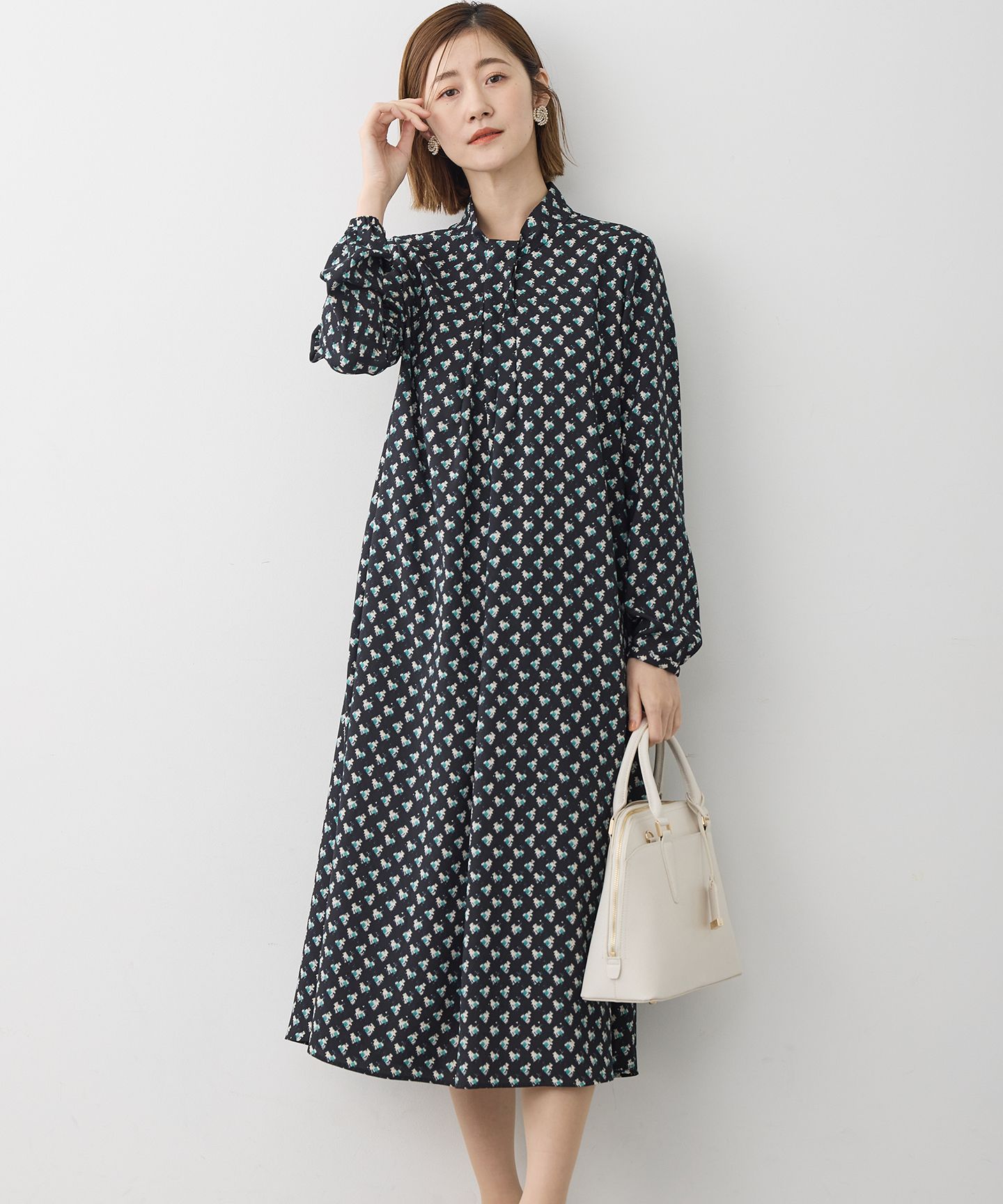 2026 Pre Springアートタッチなプリントで品よく映える、総柄ワンピース■デザインイタリア図案をベースにアレンジしたオリジナルの柄の長袖ワンピース。イタリアの感性を感じるアートタッチな柄を、着用しやすいモチーフサイズで仕上げています。小ぶり柄ながらさりげなく色味を感じさせる配色で華やかさを演出します。襟元にボウタイのようなディテールを入れることで、ジャケットのインナーとしても映えるデザインです。共布ベルトですっきりとした着こなしも楽しめます。通勤やオケージョンなどのきれいめスタイルにも活躍する1着です。カラーは優しく柔らかな雰囲気のベージュ(#502)と、知的で洗練された印象を与えるネイビー(#575)の2色展開です。■素材ポリエステル素材のバックサテンジョーゼットにオリジナルプリントを施した素材を使用しています。表面はジョーゼット、裏面はサテン組織にすることで、さらっとした着心地が特徴です。表面のジョーゼットはランダムで細やかな表面感と微光沢感がありプリントを美しく表現します。ポリエステル100%で、シワになりにくく、イージーケアできるのもうれしい素材です。■同シリーズモダンアートプリント ブラウス(品番: BLWOLS6101)※画像はサンプルを使用している為、実際にお届けする商品と仕様が異なる場合がございます。※サンプルはモデルサイズを使用している為、実際の商品のサイズはサイズ詳細の実測をご参照ください。