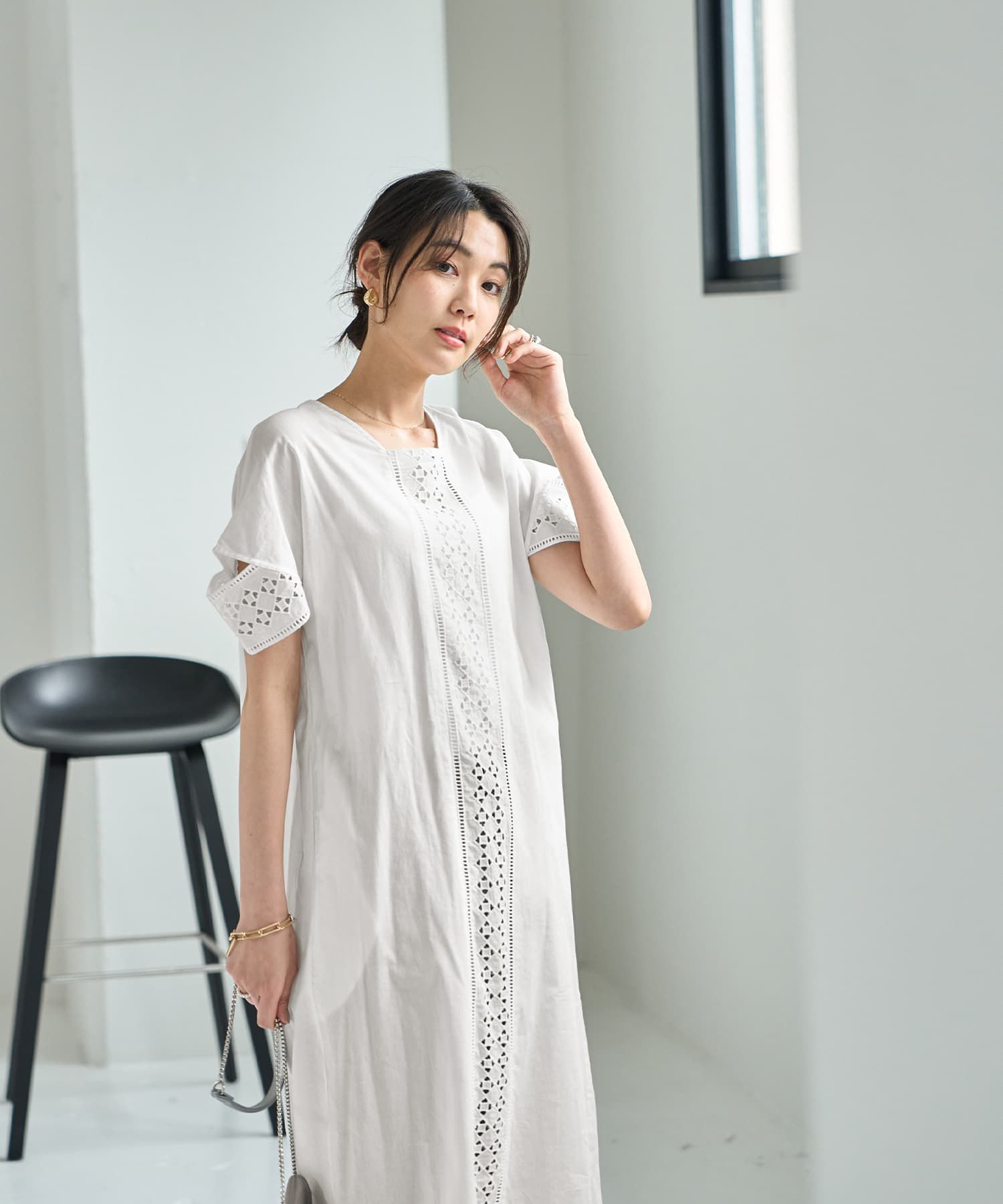 透け対策をしてワンピースのように着ることもできますし、上品な透け感を活かしながらレイヤードスタイルを楽しむこともできます。生地の中央や背中に挟みこんだレースはとても美しく、高級感もたっぷり。さらにそのレースを袖下にもあしらい、見た目の可愛さと二の腕カバー効果が得られる両軸視点でのポイントにしています。【デザインや仕様について】◆美しいレースを効果的に使用した、ワンピース型カバーアップ。◆緩やかなAライン。広がり感は控えめで大人っぽいフォルム。◆ふくらはぎが完全に隠れる丈感が基準。◆ゆったりとしたサイズ感。◆鎖骨が見える台形ネック。胸元はかがんでも見えない開き加減。◆二の腕がカバーできる袖デザイン。皮膚は見えつつ太いところは隠せる技あり構造。◆背中側にもレースを挟み込んだ贅沢なデザイン。後ろ姿も素敵。◆背面中央にファスナー&上部ホックあり。◆背面襟ぐりよりタックあり。背中にはり付かず、なんとなくふんわり。◆両サイドポケットあり。◆裏地:なし◆手洗い:可能◆丈詰め:行っていただけます。【生地について】高価なコットンハンカチのような生地(ナヨナヨ系の柔らかいものではなく、薄手でハリがある、キメの細かなタイプの綿織り生地)。スッキリとして品があり、でもどことなくコットンならではの気取りの無さもあり…といった、女性らしさとナチュラル感のある魅力的な生地です。柔らかいというよりは『しなやか』という感じで、サラッとサッパリした肌触りの涼しい着心地。コットンなので多少のシワはできますが、嫌な感じのシワにはならず、デザインの中に溶け込みます。◆アイロン:不要(シワが気になる部分には霧吹きをかけ、指でシワを伸ばして→ハンガー掛けで吊るしておけばOKです)◆生地の厚み:薄手寄り◆伸縮性:なし◆透け感:あり◆光沢感:なし【お知らせ事項】◆袖のデザイン構造上、腕を横方向に上げるときは多少の動かしづらさを感じることがあります。ただしその場合も許容範囲内で、日常的な動作にストレスになるほどではございません。予めご理解くださいませ。◆レース部分はお素材上、多少の毛羽立ちが生じますので、繊維の飛び出しが気になる場合は糸切りハサミで余分な繊維をカットしてご着用ください。※上記の事象は構造上、素材上の特性となりますので、これらが理由によるご返品・ご交換はお受けいたしかねます。予めご了承ください。【お色について】◆ブラック:通常の定番的なブラックです。◆ホワイト:普通のホワイトです。クリーム色感などはありません。・素材の風合い、生地へのダメージ・型崩れ予防のためには、ドライクリーニングをおすすめいたします。・具体的なお取り扱い方法・注意事項は、商品裏に縫い付けの品質表示タグをご覧ください。・品質表示タグのお取り扱い方法以外のお手入れ方法は、お客様ご自身の責任のもとお願いいたします。【お手入れについて】※ご自宅で手洗いは可能ですが、オシャレ着であることを十分にご考慮の上、お手入れをお願いいたします。デリケート衣類用洗剤および柔軟剤の使用、色移り防止のため単独洗いがお薦めです。※オシャレ着であることを十分にご考慮の上、お手入れをお願いいたします。デリケート衣類用洗剤および柔軟剤の使用、色移り防止のため単独洗いがお薦めです。※濃い