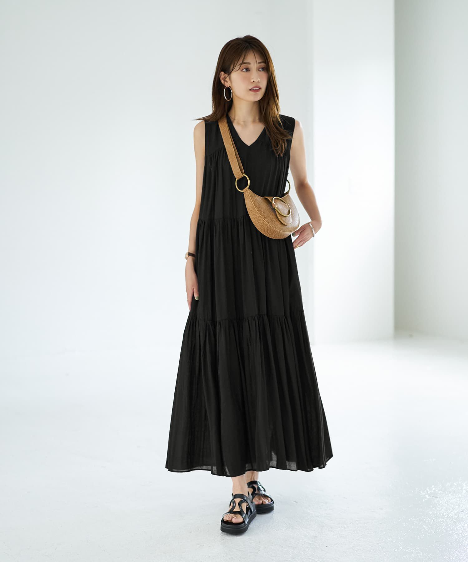 諦めていた幻のワンピが奇跡の再登場!少し遅れましたが抑えておいて損ナシです【名作!エアリーな楊柳生地のワンピース】◆雰囲気のある質感がオシャレな、高級感のあるティアードギャザーワンピース。スッキリと見えるVネックと落ち感による膨張回避シルエットで、体型カバーも叶う一枚です。◆何も考えたくない時でも頭からこれをかぶって着るだけで、人に「可愛いワンピース!」と褒められるような究極の時短ワンピースとして定評のある鉄板デザイン。体調の悪いとき、時間のないとき、面倒なときなども本当に便利ですし、涼しくてラクなので旅先のホテルで朝食会場に行く際なども活躍します。◆薄手で柔らかく、僅かにシャリ感のある楊柳生地を使用。通常の楊柳よりもシボの入り方が細かく、線も細くて上品さがあり大人っぽい雰囲気があります。◆落ち感が良くシワになりにくい素材。肌触りはサラサラで柔らかく、汗ばむ日でも肌離れの良い涼しい着心地。通気性も良く、熱もこもりません。◆ジャケットやカーディガンなどの羽織りもの全般と相性が良く、カジュアルオフィスコーデにもOKの使いやすいデザイン。一枚で着ても露出感が高くないため品があり、大人のデイリーウエアにピッタリです。◆ゆったりとしたサイズ感で、身体のラインを響かせないAラインシルエット。下腹はもちろん腰張りやヒップ、バストの大きさ&小ささもカバーできます。◆生地の美しさもさることながら、丁寧に入れたギャザーの美しさやドレープのキレイさも素敵。数々の美しさが重なり、大人に相応しい質感に仕上げられています。◆品の良さがありキレイめに着ることもできますが、スニーカーやスポサン合わせでカジュアルに着たりすることも可能。お好みに合わせて雰囲気調節をしていただけます。◆上記のように、涼しくラクな着心地./シワにならない便利さ/程よいラフさと適度なキレイめ感/優れた体型カバー効果/スニーカーにも合うなどの要素が揃っていることから、旅行や帰省用のお洋服としても人気があります。◆この生地の涼しさとエアリーな質感を壊したくないことに加え、重さを出さないよう、あえて裏地は付けずに仕上げています。着用して下着が透ける感じはありませんが、生地が薄いため光が当たると屋外での透過(薄っすらと脚の形が透けて見える感じ)の可能性もあるかもしれません。そのため気にされる方は、お好みのペチコート等のインナーをご着用してお使いになるのがお薦めです。◆基本的にシワは気になりませんが、もしも気になる場合は霧吹きをかけてよく湿らせ、手指でシワを軽く撫で伸ばしてハンガーに掛けておけばイイ感じの状態になります(アイロンは不要)。◆前作からの変更点はありませんが、Vネック周りの改善微調整(下記1、2)を行いました。その他生地やサイズ感などは全て変更ナシの同じとなります。(1)胸元の開き加減の深さを1.5cm浅くしました。(2)Vネック裏の身返し生地が着ているとオモテに出てきやすかったため、2cm長くして改良をはかりました。◆使用している生地は同じですが、今回の生地は昨年のものよりもシボ感(シワを伴う表面の凹凸感)が少ない質感に仕上がっているようです。生地については生産の都度、差異が出てしまうものですので予めご理解をお願いいたします。【その他の仕様などの情報】◆着