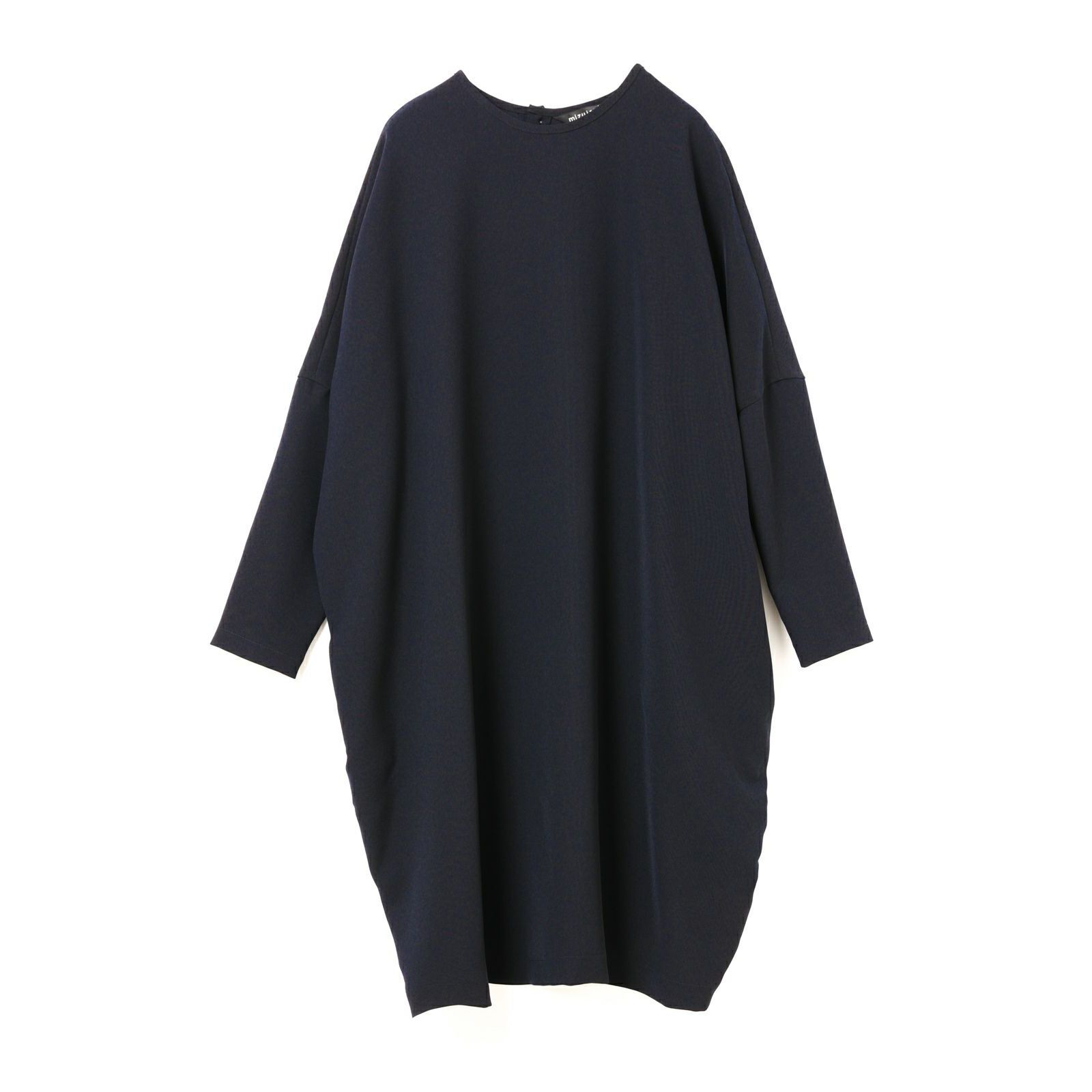 小物しだいでカジュアルにもフォーマルにも着られ、一枚あると重宝するワンピース。ダブルクロスのしわになりにくい生地を使用し、着心地はなめらかだ。レギンスや細身パンツとも好相性。ワイドなコクーンシルエットをきりっと引き締める、ほどよいあき具合のクルーネックが上品な印象。