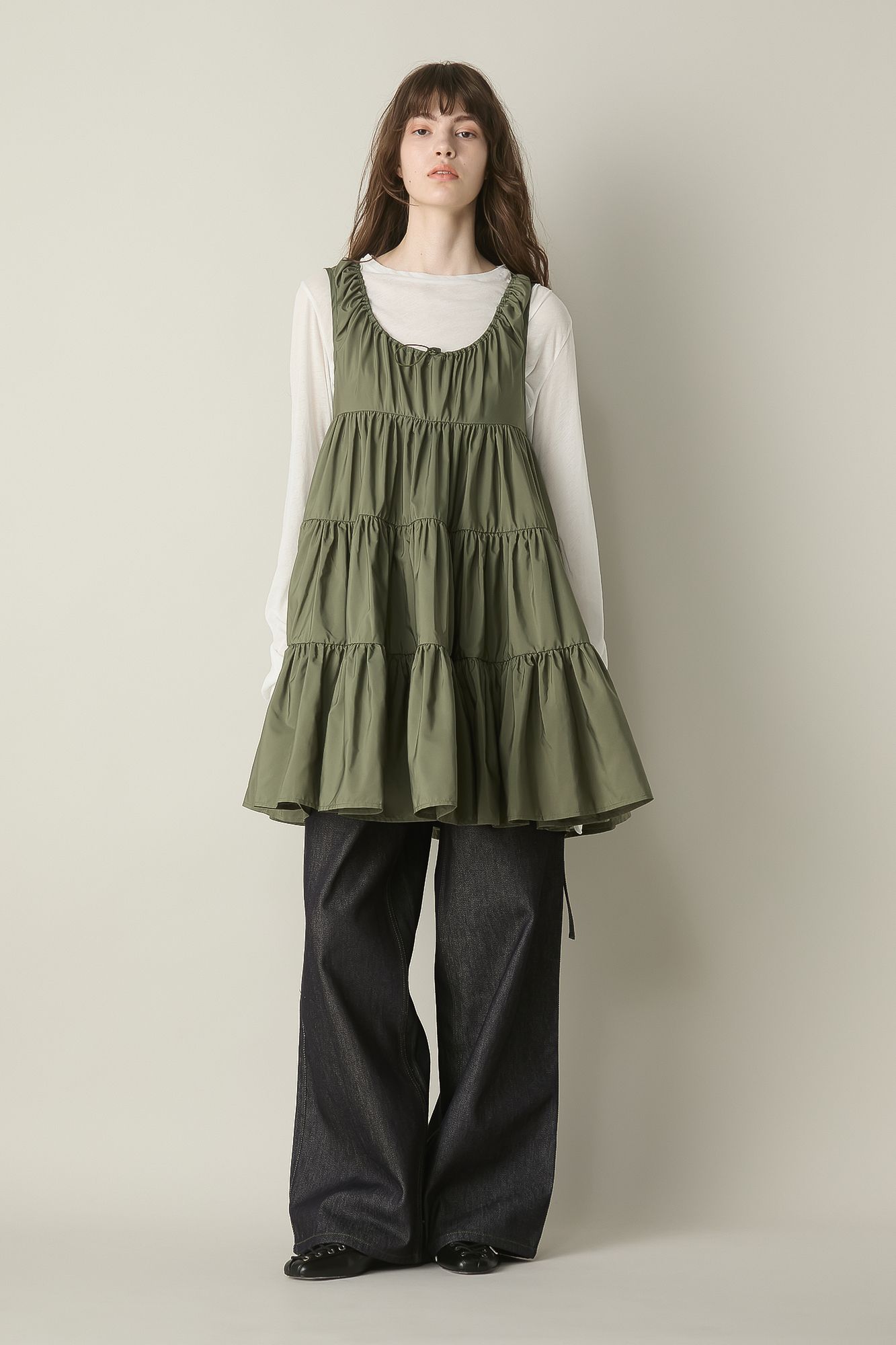 カシュクール風の胸元やフリルギャザーのラッフル袖が大人キュートなドレス。ミドル丈のスカート部分はティアードで仕上げ、細見えもアシスト。コットン100%の生地でカジュアルときれいめのバランスも良く、幅広く活躍してくれます。