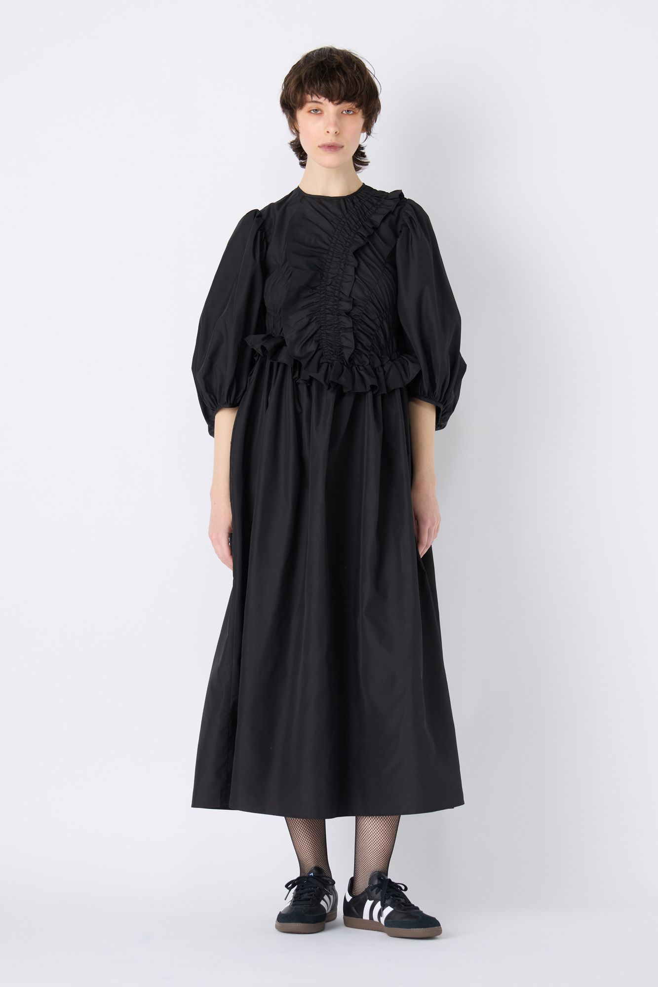 エルボースリーブの膨らみが、クラシカルなレディムードを叶えるドレス。リサイクルファイユの生地もさらりと滑らかな風合いで、流れるようなドレープを実現。前後にギャザーやフリルをふんだんに効かせ、ワンカラーながらも主役級の存在感です。