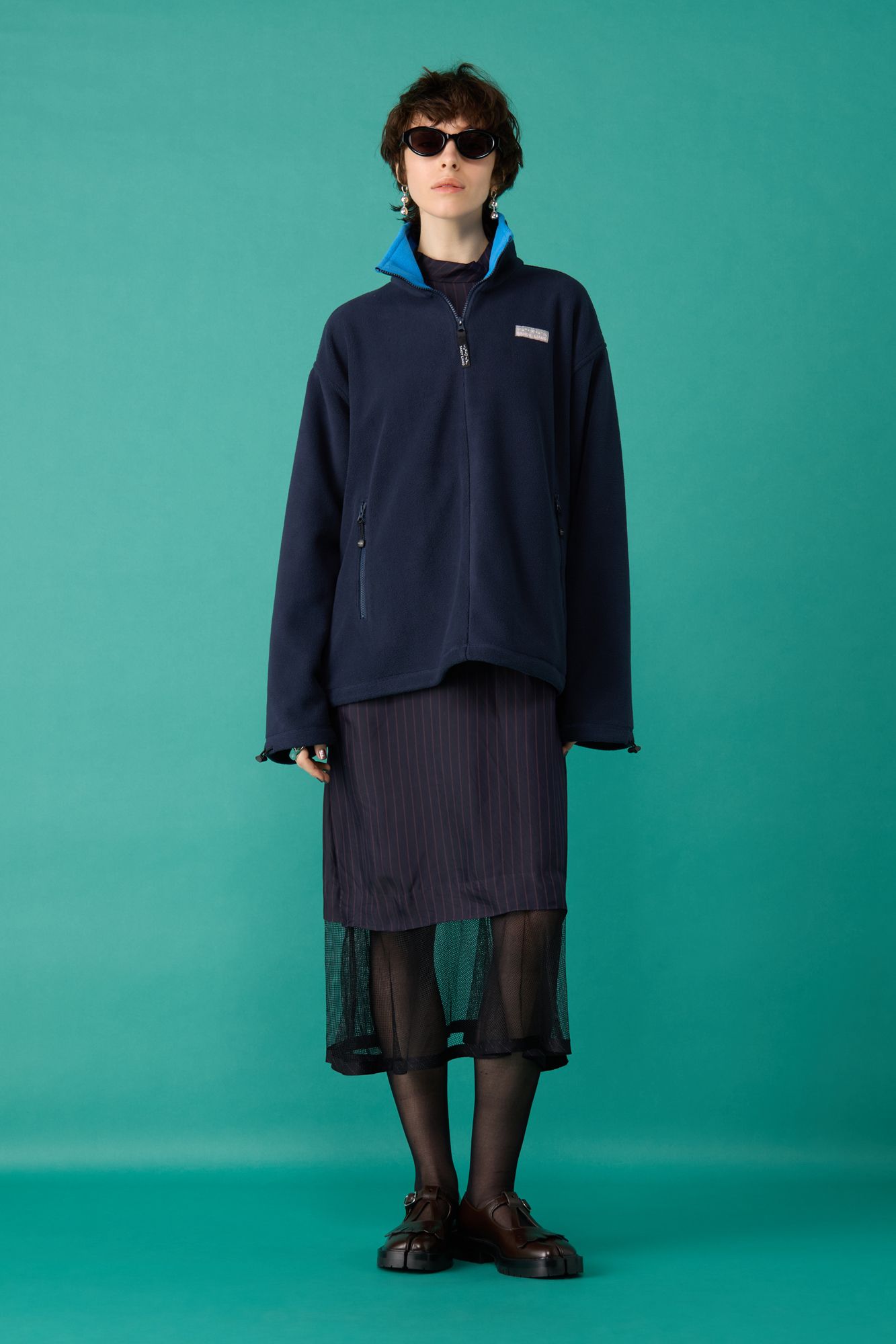 プリントシャツと、やや透け感のあるプリーツスカートをドッキングさせた一着。シックに艶めくフラワー柄でエレガンスが増し、そこはかとなく漂う品も魅力。シャツからスカートの裾付近までスナップボタンで開けられるので、羽織り風の着こなしも楽しめます。