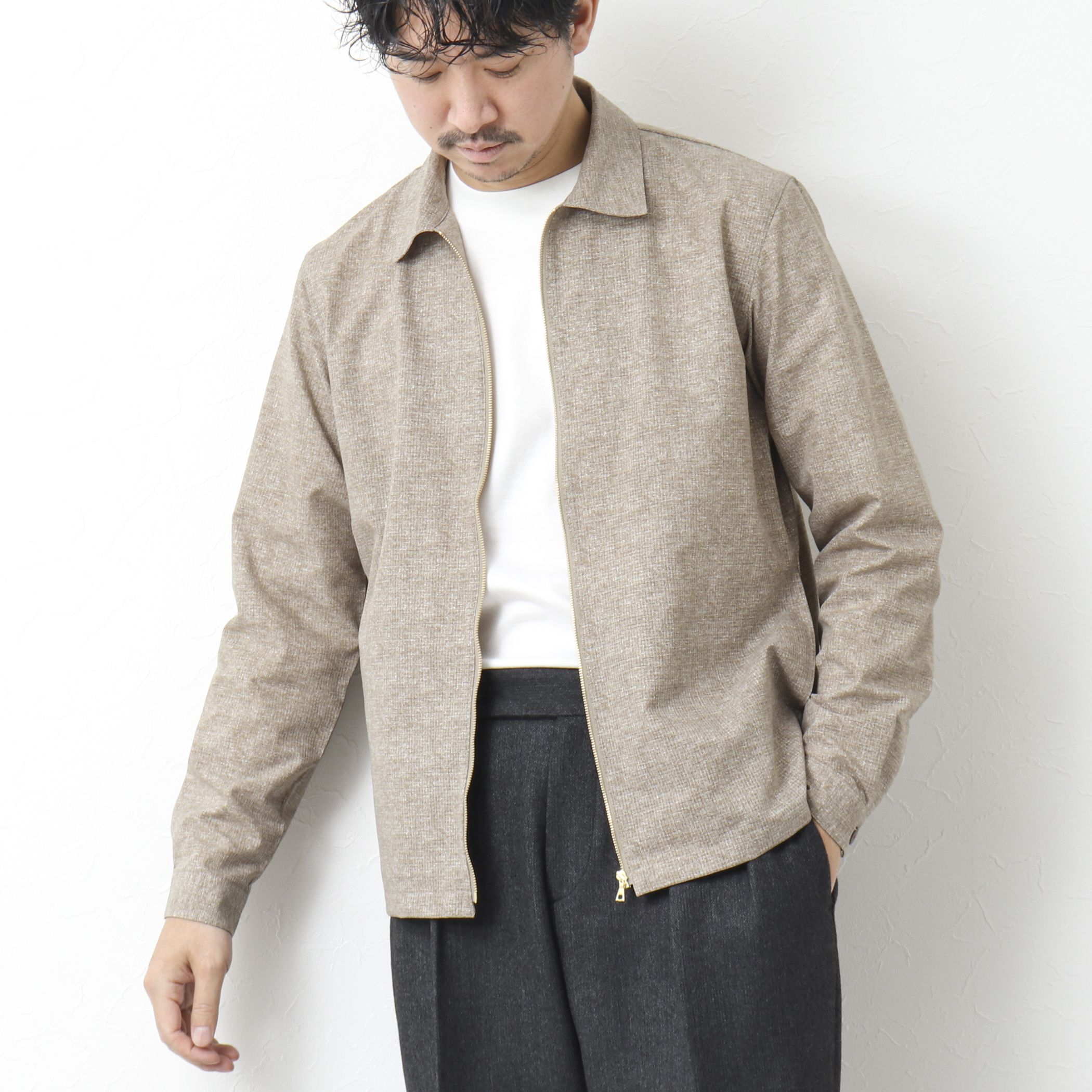 機能素材を定番アウターのディテールに落とし込んだシャツ以上ジャケット未満の絶妙なアイテム◆素材・高いストレッチ性・キックバック性・軽量性を持ち 耐久性も備えた高機能素材Primeflex(R)を採用・ドライで清涼感のあるナチュラルテイストな リネン調ポリエステル素材RIRANCHA(R)を使用・メランジ感のある鹿の子組織・速乾性/ストレッチ/防シワ/ウォッシャブル◆デザイン・ジップアップ型でアウターライクに・適度なリラックス感とスッキリとした着丈・両サイドにポケットを配置・フロントジップ仕様ネイビー/ミディアムグレー:フロントジップカラーはシルバーベージュ:フロントジップカラーはゴールド◆スタイリング・Tシャツの上に羽織るだけで簡単に決まる・チノパンを始め、スラックスライクなパンツとの相性も◎・季節の変わり目や冷房対策でもきちんと決まるー・ー・ー・ー・ー・ー・ー・ー・ー・ー・ー透け感:ほぼなし裏地:なし伸縮性:あり光沢感:ややあり生地の厚さ:普通ー・ー・ー・ー・ー・ー・ー・ー・ー・ー・ー★気になるアイテムは【お気に入り登録】がオススメです!入荷情報やクーポン、セール情報が通知されるようになります。【お取扱い上のご注意】末永くご愛用頂くために、アテンションタグを必ずご確認の上、着用又はお取り扱い下さい。※店頭及び屋外での撮影画像は、光の当たり具合で色味が違って見える場合があります。商品の色味は、スタジオ撮影の画像をご参照下さい。※商品画像に関しては出来る限り忠実に表示出来るよう努めておりますが、お客様がご利用のモニターの設定及び特性により、実際の商品と比較し色味に若干の誤差が生じる場合があります。※画像の商品はサンプルとなりますので実際の商品と仕様、加工、サイズが若干異なる場合がございます。※製品洗い加工の商品は、多少の歪み、シワなどが見られたり、風合いやサイズ等が1枚1枚異なります。汗や雨等で濡れた時や、摩擦により色落ちし、他の衣料を汚すことがありますので(特に濃色のもの)ご注意ください。