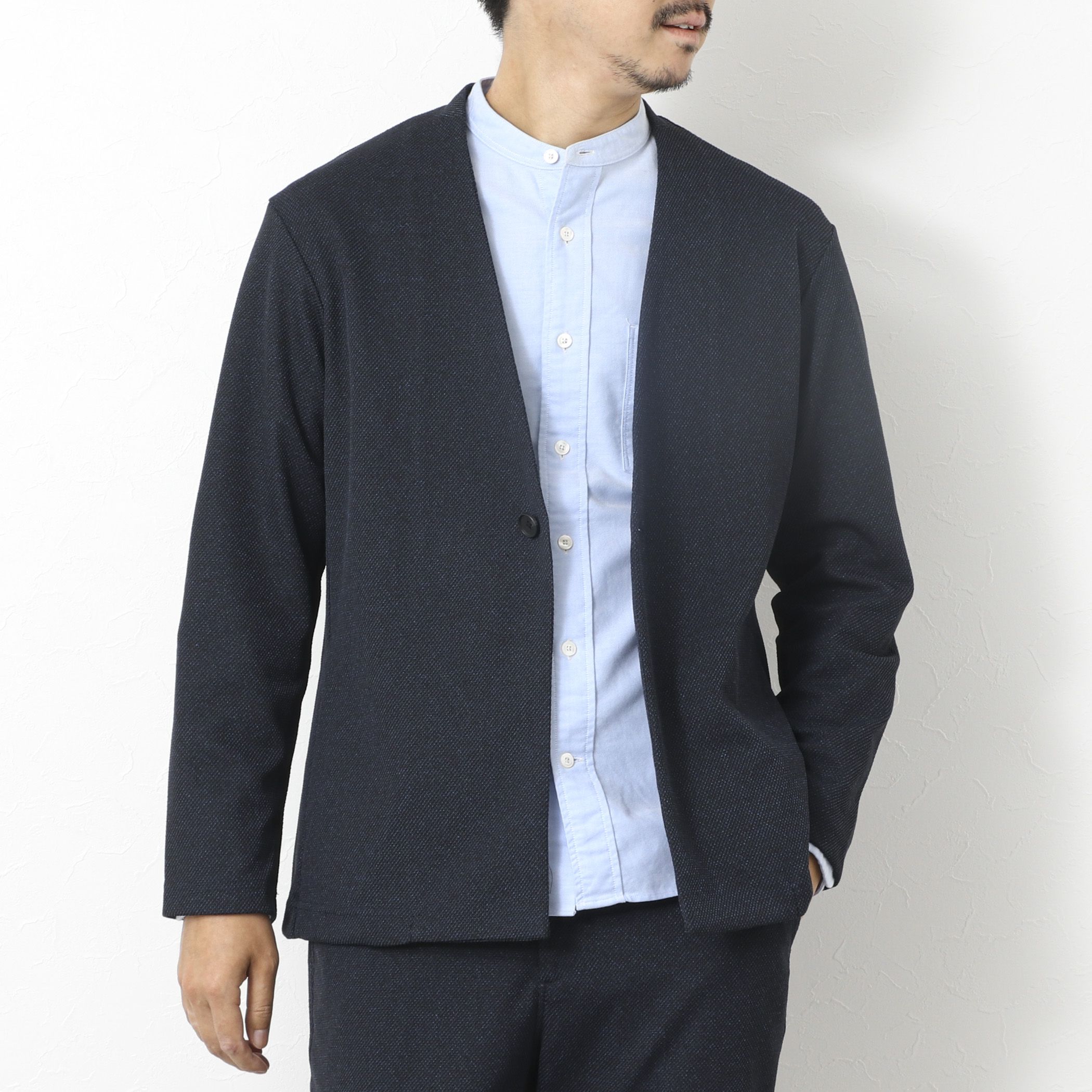 カジュアルからビジネスまで使える素材感を楽しめるノーカラージャケット◆素材・尾州産ハイブリッドジャージ※使用・ウールライクなポリエステル素材・立体感がありドレス見えするハニカム組織※ウールの産地尾州で製法はそのままに先染めポリエステル糸使いと組織によるウォッシャブル・通気性機能を加えたハイブリッド素材。◆デザイン・カーディガンのデザインを踏襲したジャケット型・ラペルを削ぎ落したミニマルな印象・簡素ながらきちんと見えるディテール・フロント2つボタン/裏地無し/ベント無し/筒袖◆スタイリング・カジュアルシーンからビジネスシーンまで着用可能・シャツはもちろん、Tシャツやニットとの合わせも・単品使いはもちろん同素材のパンツ(5-0086-5-59-003)とのセットアップもー・ー・ー・ー・ー・ー・ー・ー・ー・ー・ー透け感:ほぼなし裏地:なし伸縮性:あり光沢感:ややあり生地の厚さ:普通ー・ー・ー・ー・ー・ー・ー・ー・ー・ー・ー★気になるアイテムは【お気に入り登録】がオススメです!入荷情報やクーポン、セール情報が通知されるようになります。【お取扱い上のご注意】末永くご愛用頂くために、アテンションタグを必ずご確認の上、着用又はお取り扱い下さい。※店頭及び屋外での撮影画像は、光の当たり具合で色味が違って見える場合があります。商品の色味は、スタジオ撮影の画像をご参照下さい。※商品画像に関しては出来る限り忠実に表示出来るよう努めておりますが、お客様がご利用のモニターの設定及び特性により、実際の商品と比較し色味に若干の誤差が生じる場合があります。※画像の商品はサンプルとなりますので実際の商品と仕様、加工、サイズが若干異なる場合がございます。※製品洗い加工の商品は、多少の歪み、シワなどが見られたり、風合いやサイズ等が1枚1枚異なります。汗や雨等で濡れた時や、摩擦により色落ちし、他の衣料を汚すことがありますので(特に濃色のもの)ご注意ください。