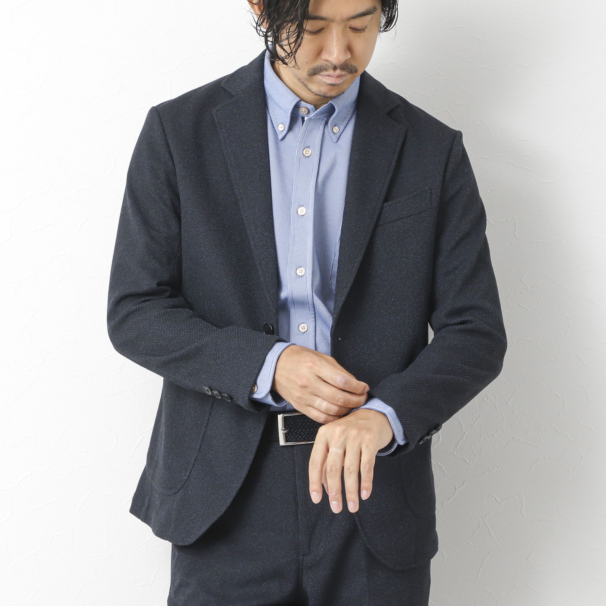 カジュアルからビジネスまで使える素材感を楽しめるイージージャケット◆素材・尾州産ハイブリッドジャージ※使用・ウールライクなポリエステル素材・立体感がありドレス見えするハニカム組織※ウールの産地尾州で製法はそのままに先染めポリエステル糸使いと組織によるウォッシャブル・通気性機能を加えたハイブリッド素材。◆デザイン・ウエストシェイプをやや抑えたシルエット・簡素ながらきちんと見えるディテール・チーフポケット内布を引っ張り出すとチーフ代わりに・フロント2つボタン/裏地無し/ベント無し/筒袖ボタン3つ◆スタイリング・カジュアルシーンからビジネスシーンまで着用可能・シャツはもちろん、Tシャツやニットとの合わせも・単品使いはもちろん同素材のパンツ(5-0086-5-59-003)とのセットアップもー・ー・ー・ー・ー・ー・ー・ー・ー・ー・ー透け感:ほぼなし裏地:なし伸縮性:あり光沢感:ややあり生地の厚さ:普通ー・ー・ー・ー・ー・ー・ー・ー・ー・ー・ー★気になるアイテムは【お気に入り登録】がオススメです!入荷情報やクーポン、セール情報が通知されるようになります。【お取扱い上のご注意】末永くご愛用頂くために、アテンションタグを必ずご確認の上、着用又はお取り扱い下さい。※店頭及び屋外での撮影画像は、光の当たり具合で色味が違って見える場合があります。商品の色味は、スタジオ撮影の画像をご参照下さい。※商品画像に関しては出来る限り忠実に表示出来るよう努めておりますが、お客様がご利用のモニターの設定及び特性により、実際の商品と比較し色味に若干の誤差が生じる場合があります。※画像の商品はサンプルとなりますので実際の商品と仕様、加工、サイズが若干異なる場合がございます。※製品洗い加工の商品は、多少の歪み、シワなどが見られたり、風合いやサイズ等が1枚1枚異なります。汗や雨等で濡れた時や、摩擦により色落ちし、他の衣料を汚すことがありますので(特に濃色のもの)ご注意ください。