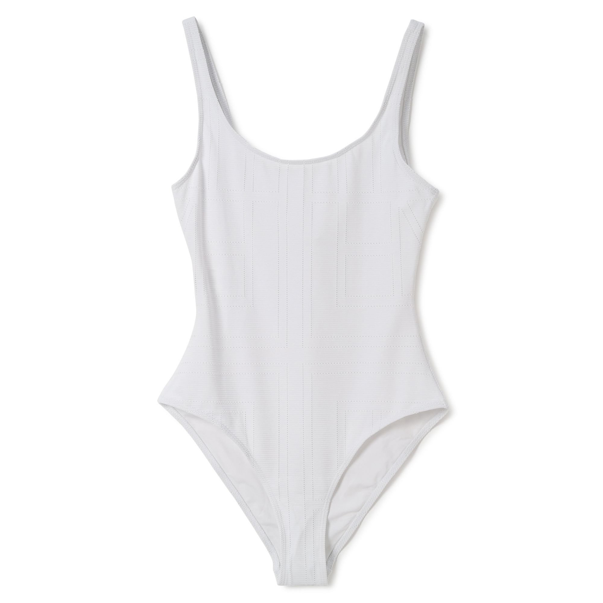 胸元が大胆に開いたスクープネックのスイムウェア。伸縮性があるので快適にフィットし、生地の艶めきが女っぽさや色気も獲得。抑揚をつくれるモノグラム柄がどこかレトロな雰囲気で、プールやビーチでも視線を集めそう。