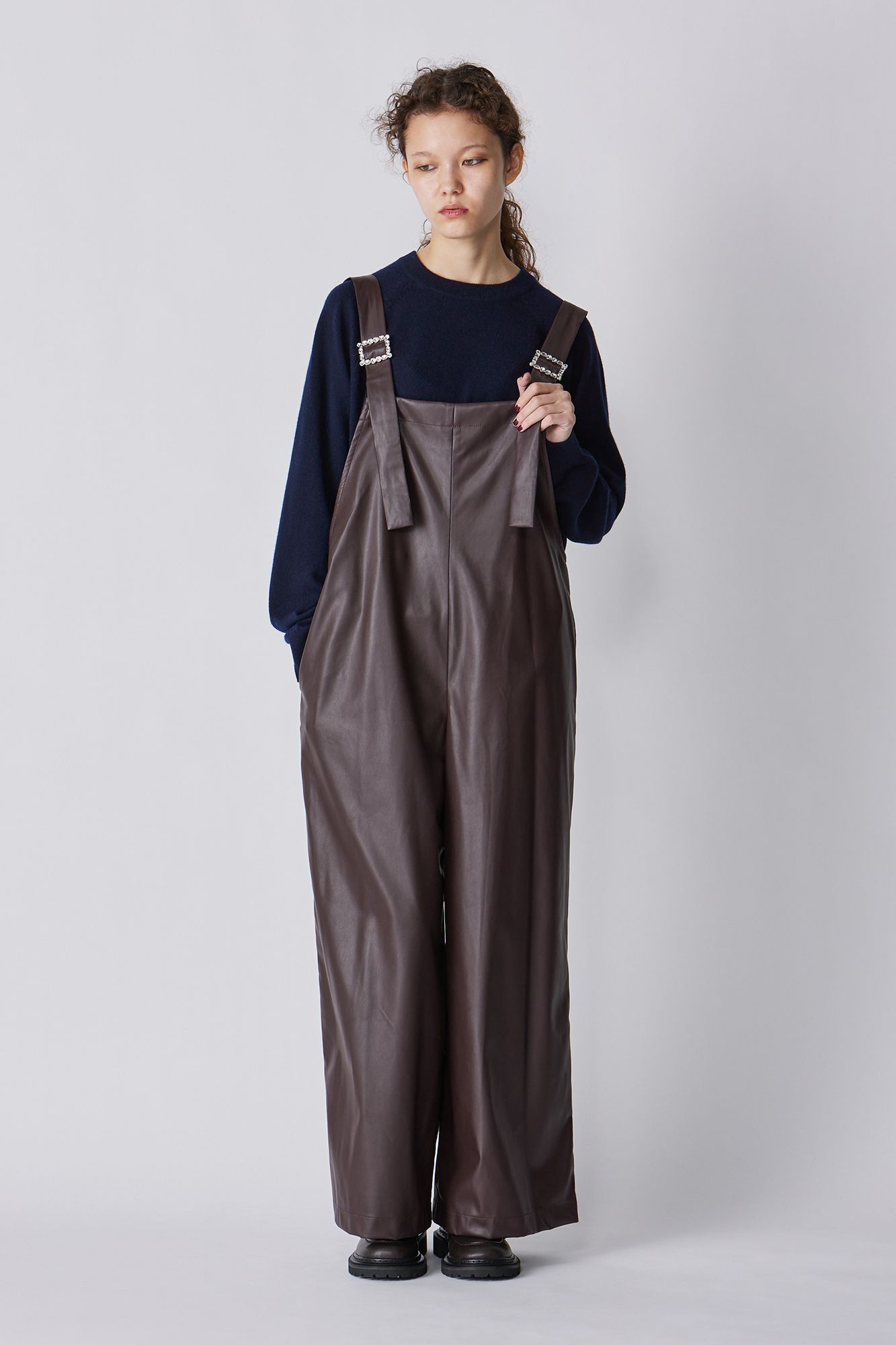 カジュアルにもモードにも効く、ゆったりフォルムのサロペット。艶めくフェイクレザーやバックリボンがさりげなくも印象度を上げ、より上級スタイルを満喫。デコラティブなビジューの煌めきも「MUVEIL」らしいアクセントです。※内側のボタン調整でストラップの長さが調整可能