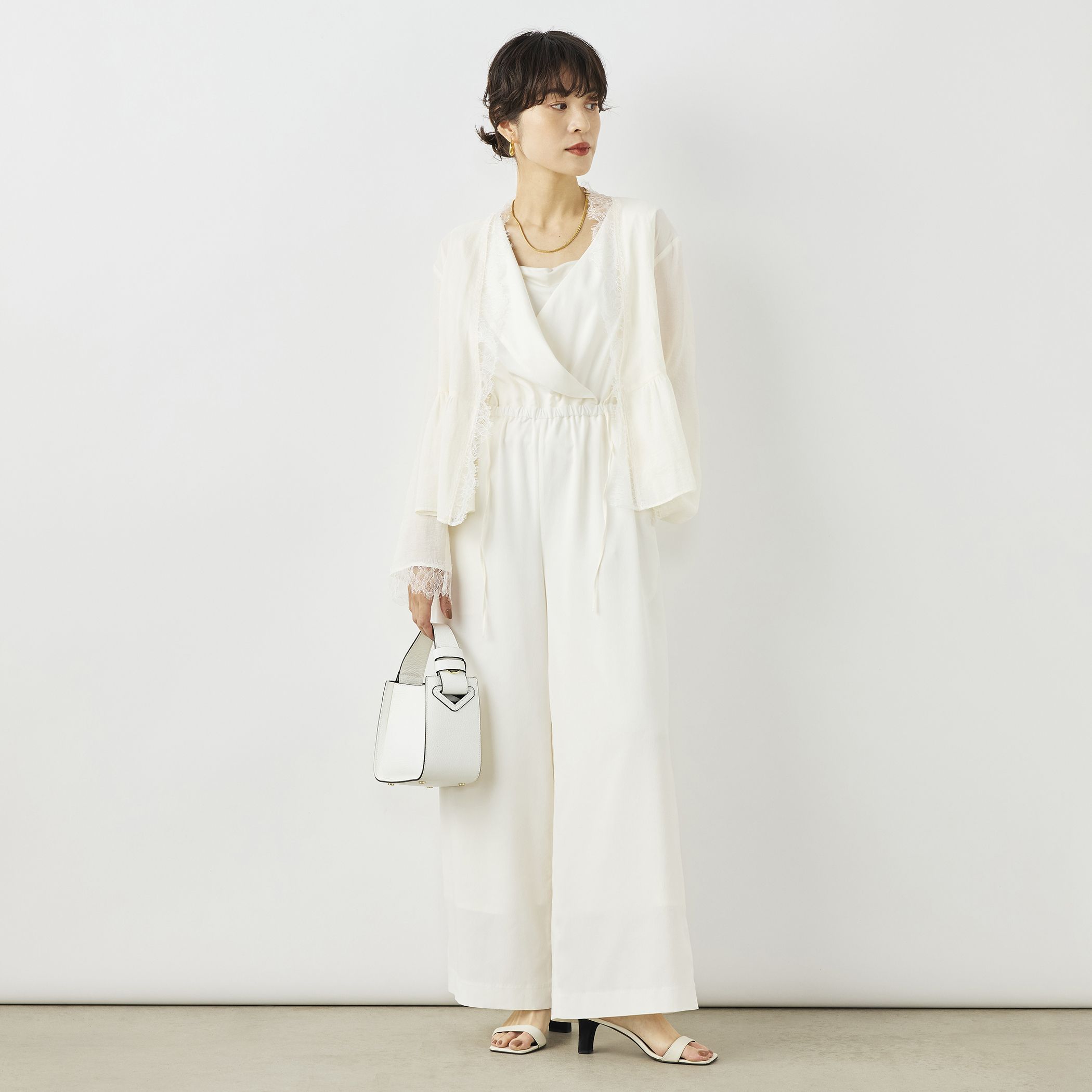 しなやかな光沢と落ち感素材の組み合わせで、オールインワンをエレガントにドレスアップ。首もとのタイはネクタイ風やリボン、そのままたらしたりとアレンジすることで印象が変化。ウエスト内側にドロストを施すことで、サイズや丈の調整ができるのもいい。胸もとを変化させるタイが上品な印象。ウエスト内側はドロスト仕様に。外からは見えずに調整可能。