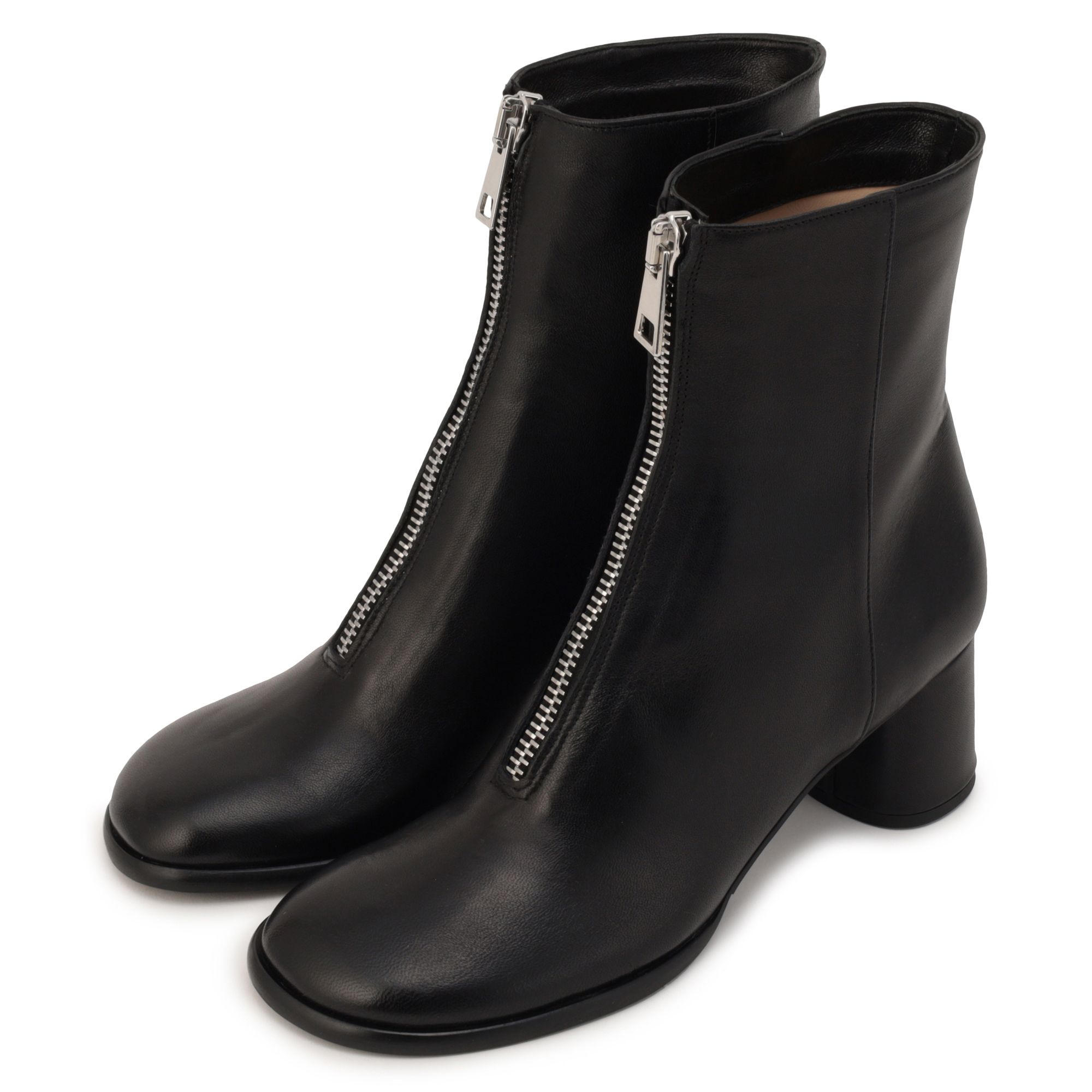 特徴的なジップがアクセントになったブーツは、ラウンドトゥで甘辛のバランスが取れたデザイン。チャンキーヒールで安定感もあります。