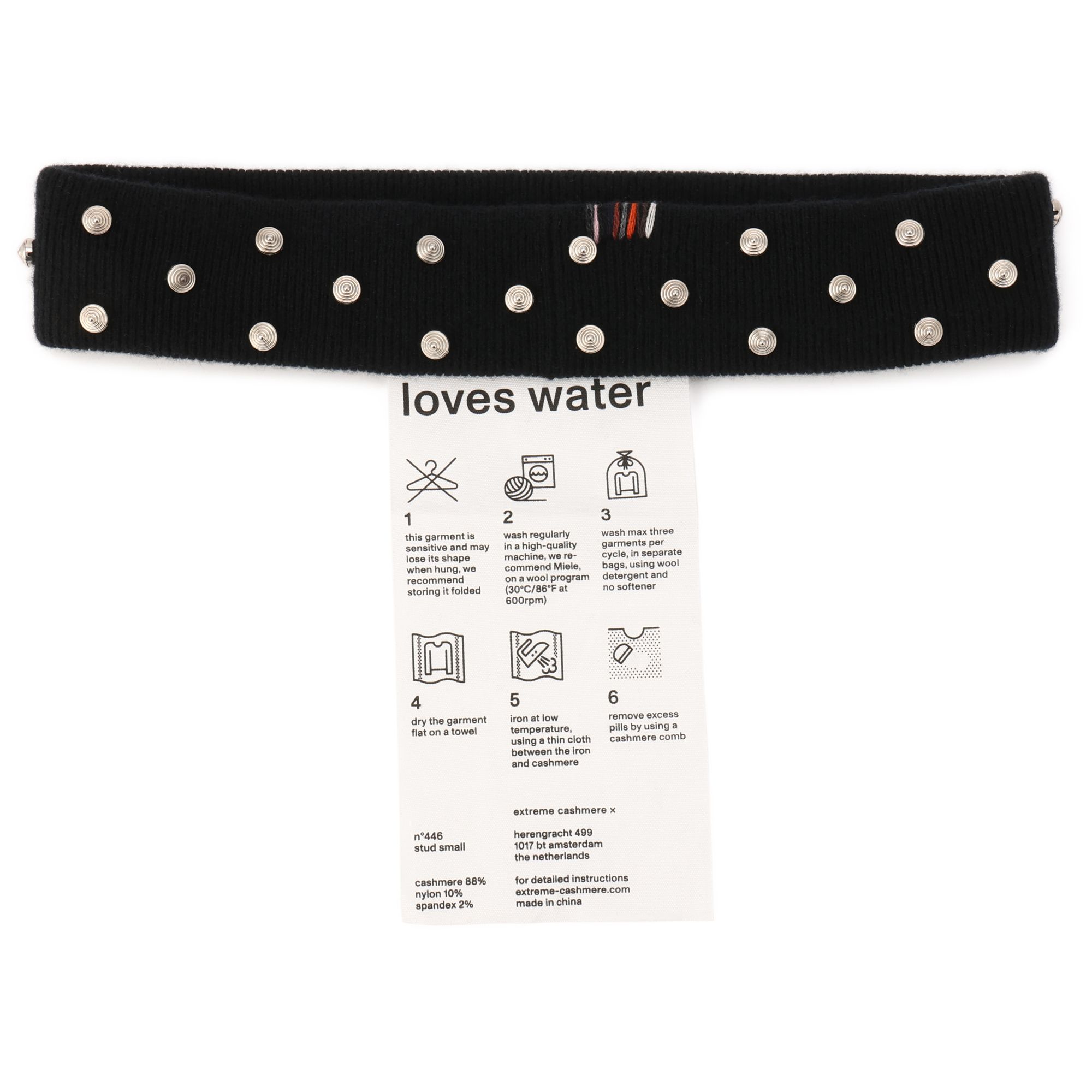 アジャスターパーツがない、上からかぶるタイプのニットベルト。シルバースタッズをあしらうことで、シンプルながらもエッジの効いた表情に。縁には「extremecashmere」を象徴する配色ステッチもあしらい、ワンポイントにしています。