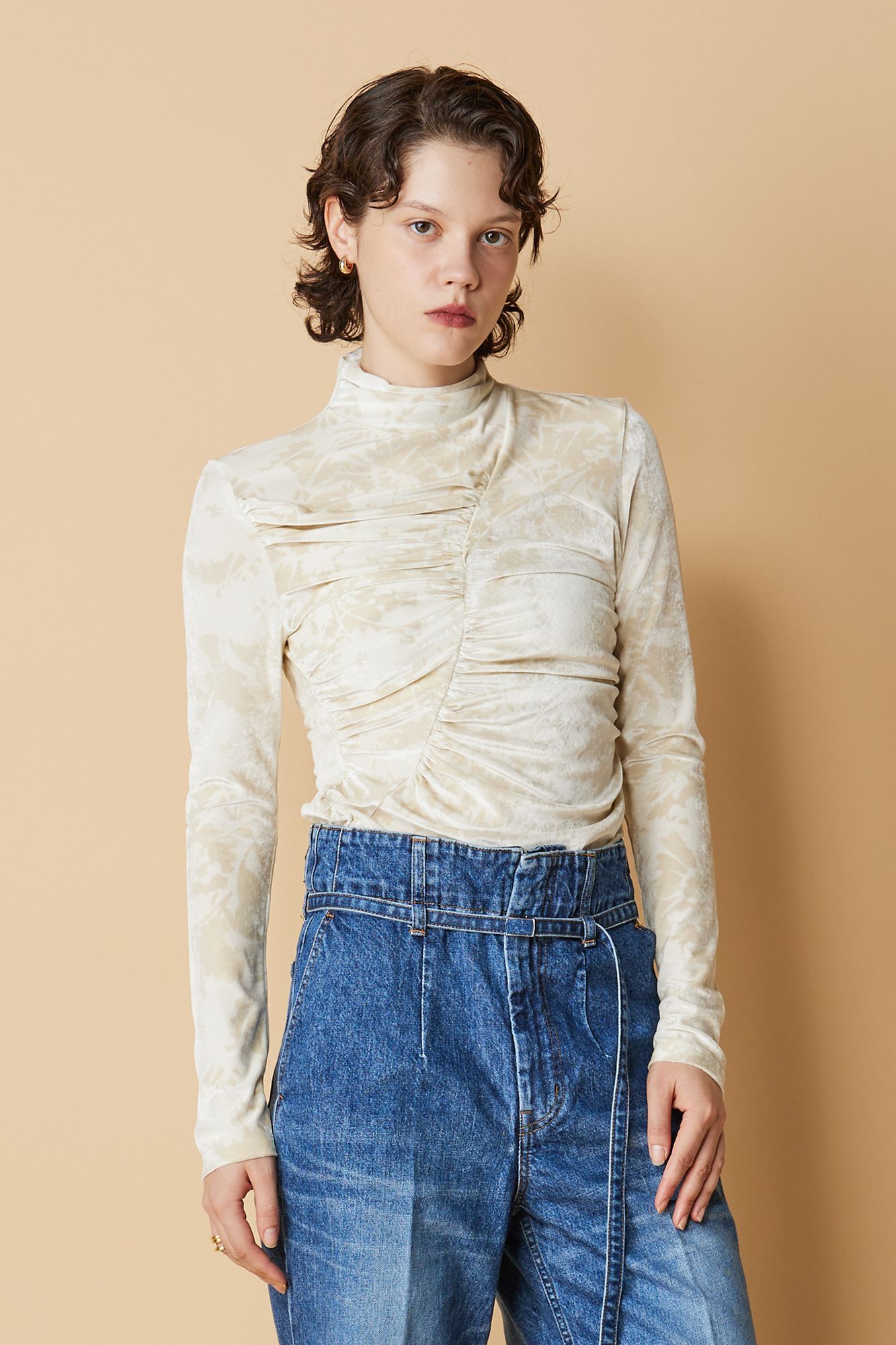 ガーベラのカモフラ柄がベルベット生地に優雅に映える、ハイネックトップス。大胆な切り替えとタックドレープがメリハリを与え、伸縮性があるので快適にフィット。バックファスナーで着脱もしやすく、どこか色気のある表情も魅力です。