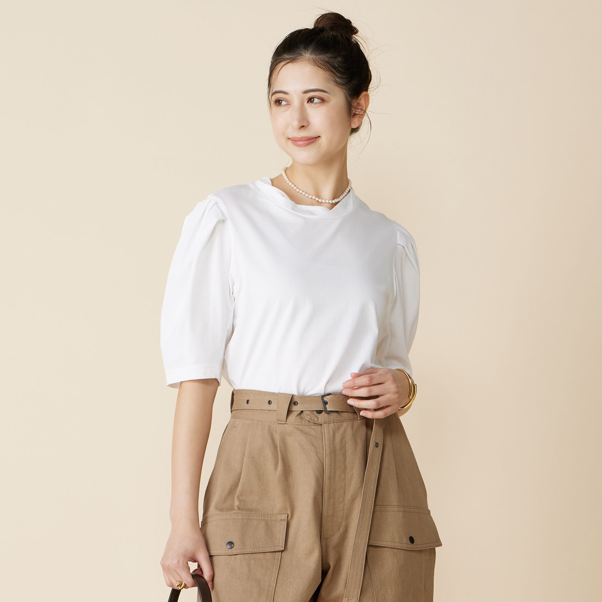 肩の切り替えラインと立体的な縫製による視覚効果でボディラインを細見え。ボトムインにしてすっきり見えるのはもちろん、アウトにしても決まる前後差のある着丈も優秀。シンプルな着こなしが様になるエクラ的名品。袖先にゴムを施しふんわりとしたフォルムをキープ。手首を華奢にエレガントに見せてくれる。