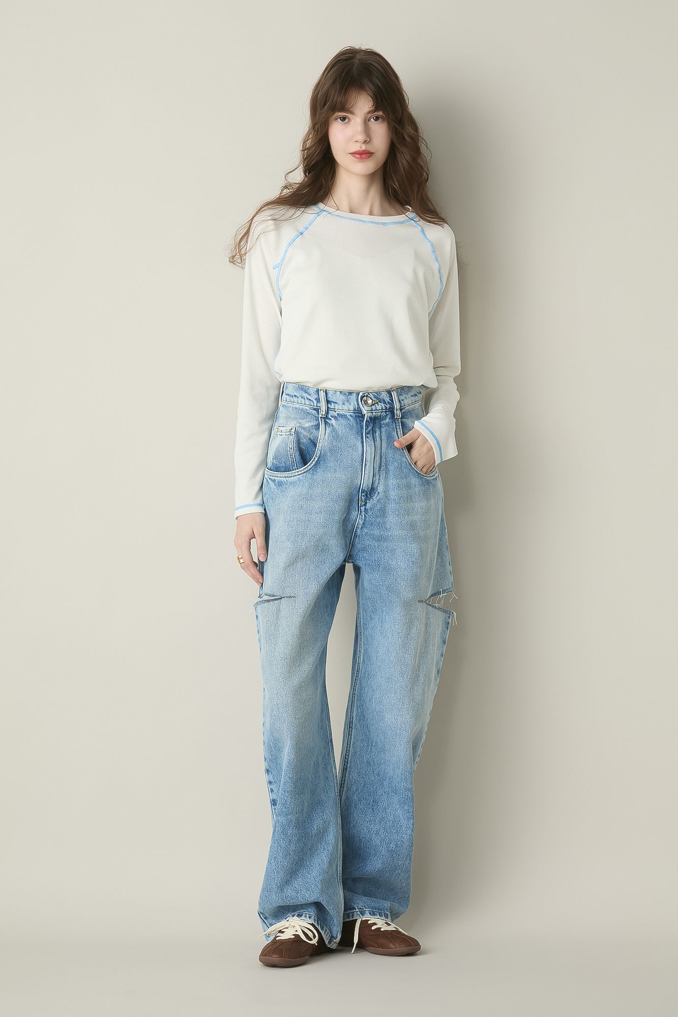 薄手の滑らかコットンで仕上げたロングTシャツ。ゆるっと着られるシルエットや長めの袖丈もふつうで終わらない印象力。「Baserange」が得意とするさりげないシアー感や、上級者見えするニュアンシーな配色の力も見逃せない。