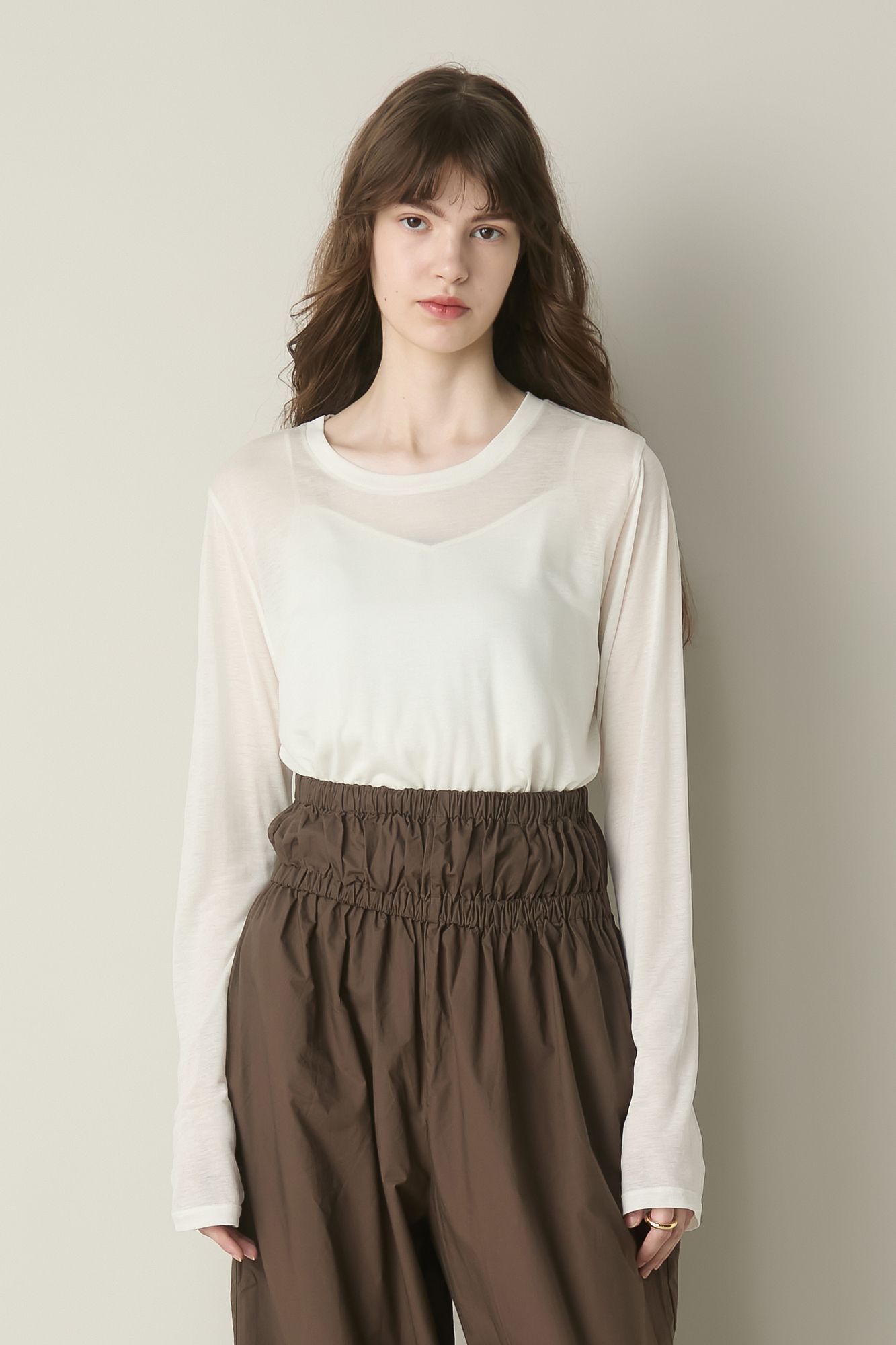 ニュアンス配色がおしゃれなバンブー&リヨセルのロングTシャツ。薄手なのでインナー使いもしやすく、ボディに添う美しいフィット感。丈夫でありながらしなやかな風合いと光沢を持つ生地なので、ナチュラルに振りすぎず幅広い着こなしにマッチします。