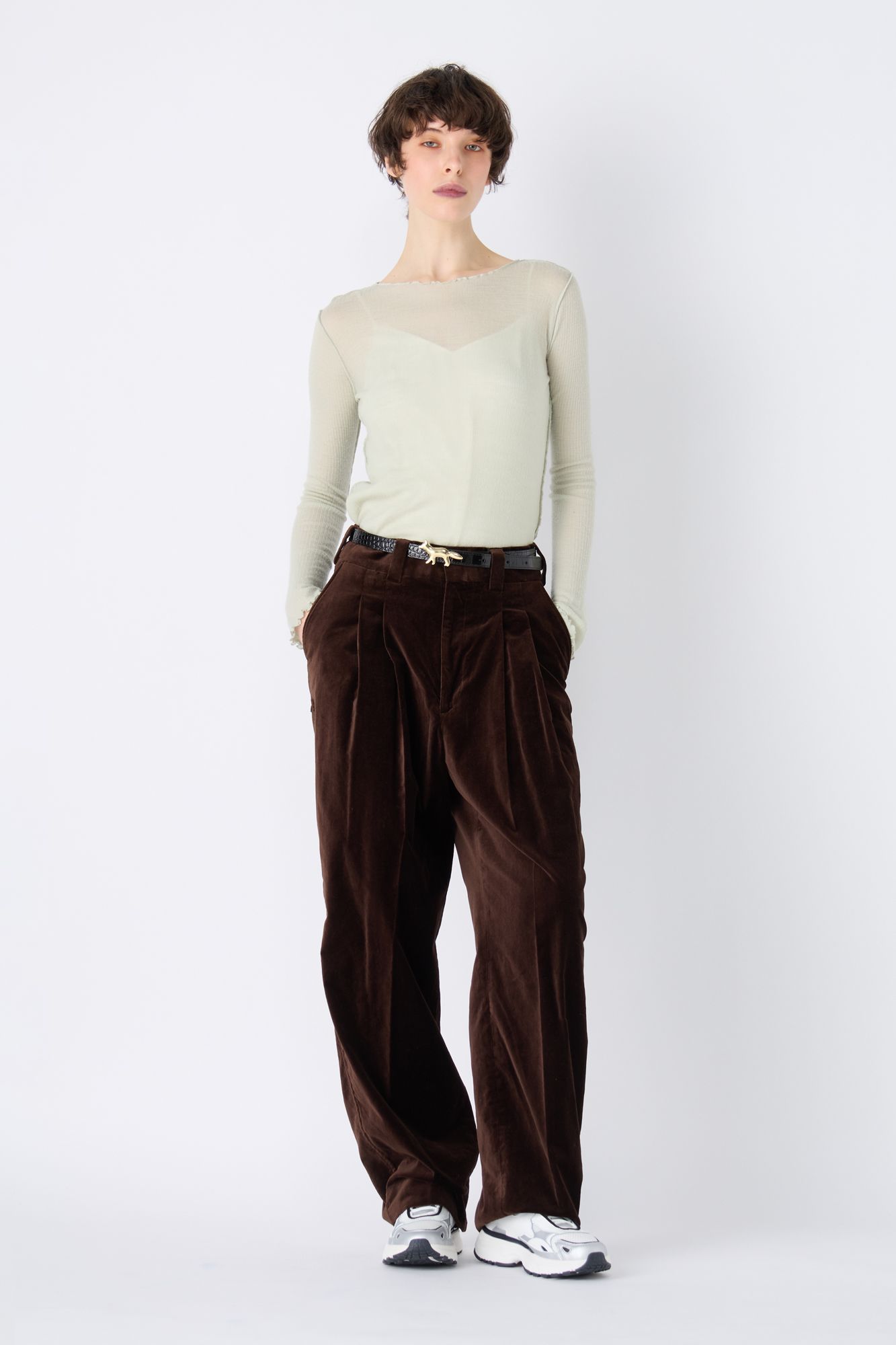ベロア素材がシーズンムードを盛り上げる、ボートネックトップス。リブ生地との切り替えデザインでメリハリを効かせ、伸縮性もあるので快適にフィット。奥行きのある表情が新鮮に映り、コーディネートに溶け込むミニマルさが重宝します。