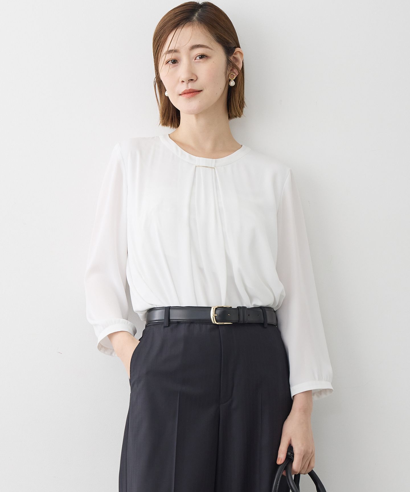 2026 Pre Springお仕事はもちろん、セレモニーなど「ハレの日」にも取り外せるアクセントバーで印象も変えられる一着■デザイン顔周りをさりげなく華やかに彩る、ゴールドカラーのアクセントバーが印象的なブラウスです。クルーネックラインに配されたバーが、アクセサリーなしでも上品な輝きをプラスし、洗練された印象を与えます。フロントには深めのタックを施し、そこからゆるやかに広がるシルエットは、気になるボディラインを優しくカバーしながら、エレガントなドレープを生み出します。パンツと合わせてスマートなオフィススタイルに、スカートと合わせてフェミニンなお出かけスタイルにと、幅広いコーディネートに活躍する汎用性の高さも魅力です。 カラーは、清潔感のあるホワイト(#001)と、上品で知的な印象を与えるネイビー(#075)の2色展開です。■素材シルクのような上品な光沢と、とろみのあるなめらかな肌触りが特徴のポリエステルデシン素材を使用しています。程よい落ち感があり、動くたびに優雅な表情を見せてくれます。肌に直接触れる内側(カットソー部分)は、滑らかで心地よい肌当たりの天竺素材を使用。快適な着心地を一日中お楽しみいただけます。▼同シリーズシルキーデシン ボールチェーン バルーン ブラウス(品番:KKWOLS0030)※画像はサンプルを使用している為、実際にお届けする商品と仕様が異なる場合がございます。