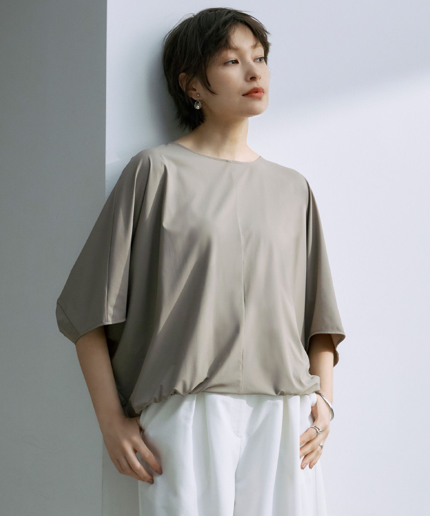 2025SS【大人気シリーズが新色を加え今年も登場】ブラウジングしたシルエットでバランスよく決まるドルマンスリーブプルオーバー■デザイン程よく身体から離れるボリューム感が特徴のドルマンスリーブプルオーバー。脇から後ろ裾にゴムが入っているので、ブラウジングしたシルエットでの着用が楽しめます。■素材生地の肉感は薄く、軽やかさが特徴のスキューバ組織のジャージー素材です。素肌に心地よい滑らかな肌触りと、適度なストレッチ性、美しいドレープ性のある素材です。オフホワイト(002)以外のカラーは生地を薄くし、より冷感性のある素材にアップデートしています。■機能性1)接触冷感ひんやりとしたタッチで夏でも快適な着心地。2)UVカット紫外線を99.4%カットしてくれるのも嬉しいポイントです。3)Washableご自宅でのお洗濯が可能なイージーケア。4)速乾性汗をかく季節でもサラリと着用可能。手洗い後に乾きが早いのも嬉しいポイント。※商品の取り扱い方法につきましては、タグ等に記載されている「取り扱い上の注意」「洗濯表示」をご確認ください。※採寸情報はサンプル商品のデータです。実際の商品と仕様が異なる場合がございます。※商品画像はサンプルを使用しているため、実際にお届けする商品と色味やサイズなどの仕様に変更がある場合がございます。予めご了承ください。