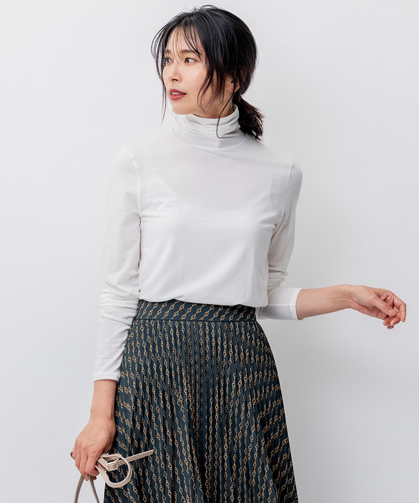 2023 Autumn & Winter先行予約程よくシアーな素材で抜け感を。重ね着が楽しくなるタートルネックカットソー■デザイン肌触りの良いセルロースにカシミヤを混紡して膨らみをもたせたカットソー。ウールのチクチクした肌触りが苦手なお客様にも、オススメのタートルです。フィットする部分にストレスと感じにくいように、肌あたりが滑らかなセルロース素材と、薄手でも艶と膨らみ、温かみあるカシミヤを混紡しています。ニットやシャツとレイヤードしやすいアイテムとなっています。カラーは合わせるものを選ばないホワイト(#001)、ベーシックなブラック(#005)、濃紺で使いやすいネイビー(#075)、差し色になるスモーキーグリーン(#063)の4色展開です。■素材上質なカシミヤとセルロースを一緒に混紡して作った糸で編立てた素材です。ストレッチ性、カシミヤの艶感、仕立ての美しさを表現し、肌心地を最大限に追及しました。編み、染めも風合いを損ねないように丁寧に作業し、作り上げました 。※画像はサンプルを使用している為、実際にお届けする商品と仕様が異なる場合がございます。