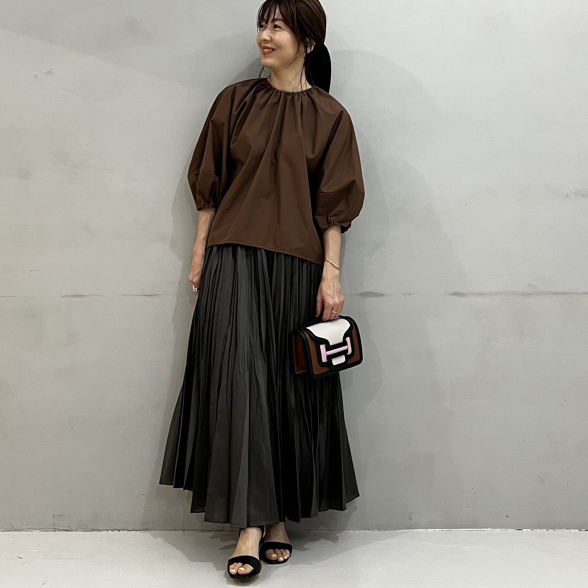 スタイリスト松村純子さんが素材選びからディテールまで吟味し、フェミニンスタイルに合わせやすいデザインに。襟ぐりにほんの少しゆとりを持たせ、さらに襟のふちを細めに設定することで顔まわりの印象が女らしく。さらに長めの半袖丈が気になる二の腕をカバーしてくれる。シルクのような光沢のある超長綿を使い、上品な見た目と肌ざわりのよさを両立。身幅や丈にゆとりがあるので動きやすく、インしやすいのもうれしい。首がすっきり見えるようにあきを調整した、やや縦長のクルーネックもこだわり。体につかず離れず、かつゆったりしすぎないほどよい身頃幅で、トレンドのボリュームボトムスとも好バランス。シルクのようなつるんとした表面感で、ラフになりすぎないのもいい。クリーンな白いスカートにブラウンTを合わせ、モダンなカラーリングに。まだまだ暑さが残る秋も、茶の濃淡グラデーションで季節を感じさせる配色に。Tシャツがこっくりとしたチョコレートブラウンだから、きちんと秋を意識したおしゃれに格上げしてくれる。肩がけしたニットのキャメルベージュと、バッグのオフホワイトを効かせ色にして。 M7daysってどんなブランド?