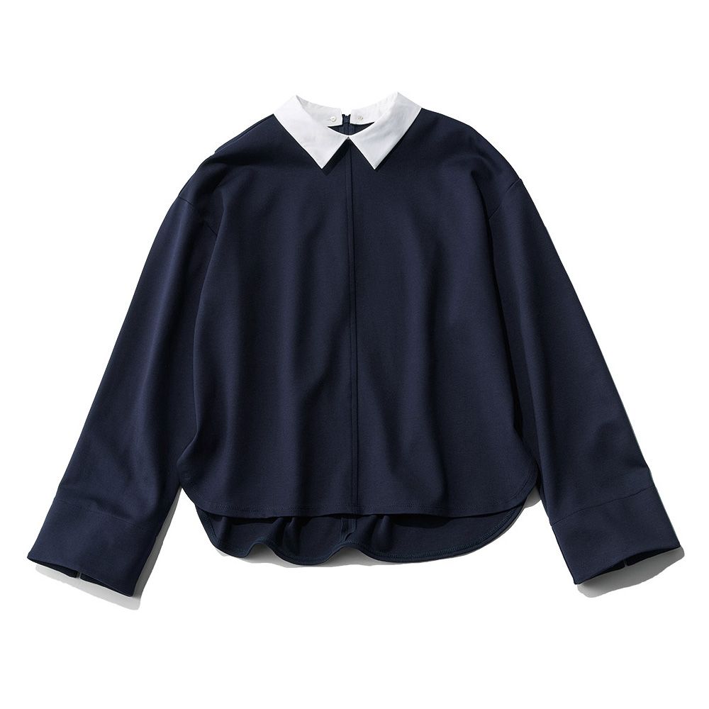 [デザイン]白衿がアクセントになったプルオーバーでシンプルながらもきちんと感を演出でき、通勤やオケージョンシーンにも活躍する一枚です。衿は取り外し可能でオン・オフ問わず着回しやすいのも魅力です。身頃は程よいハリ感とストレッチ性でシルケット加工を施しているため上品な光沢感と着心地の良さにもこだわりました。[表地]※カットソー程良いストレッチ性と肉感が特徴のポンチ素材です。ナイロン原料をブレンドすることで、独特のハリ/コシ感を見せており、快適な着心地を提供しております。またシルケット加工を施している為、上品な光沢感を表現しており、発色性を兼ね備えた素材となっております。[衿地]※布帛しなやかな伸縮性を持つ「SOLOTEX(R)(ソロテックス(R))」の中でも、フィラメントカウントの多いマルチソロテックス(R)を使用しているため、通常よりソフトな風合いのウェザーストレッチ素材に仕上げております。撥水、イージーケア性、ストレッチ性と、タウンユースからアクティブまでシーンレスに使用できる多機能素材です。さらにC6撥水からC0撥水に変更したことで、環境や健康に被害のないサスティナブル素材へと進化しました。