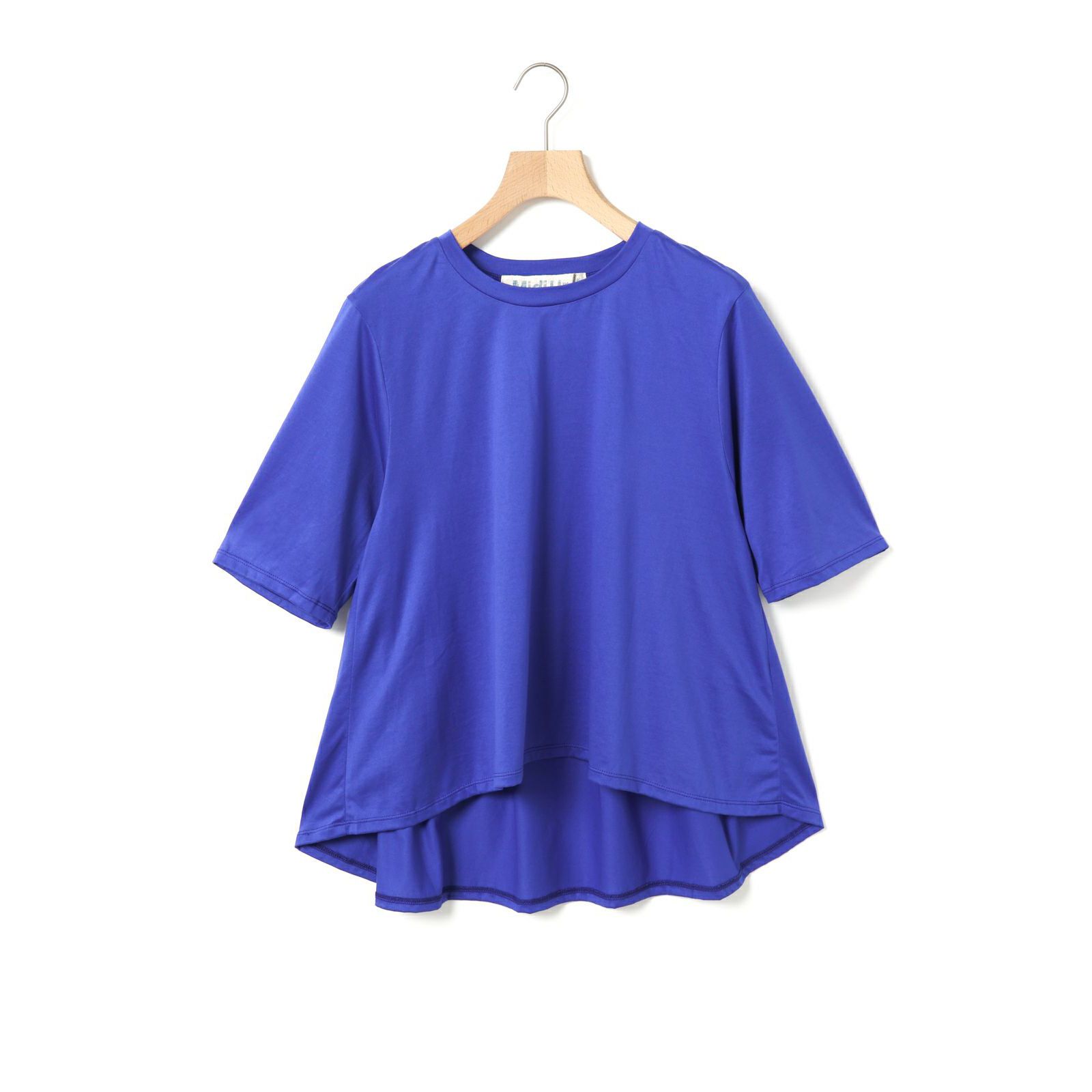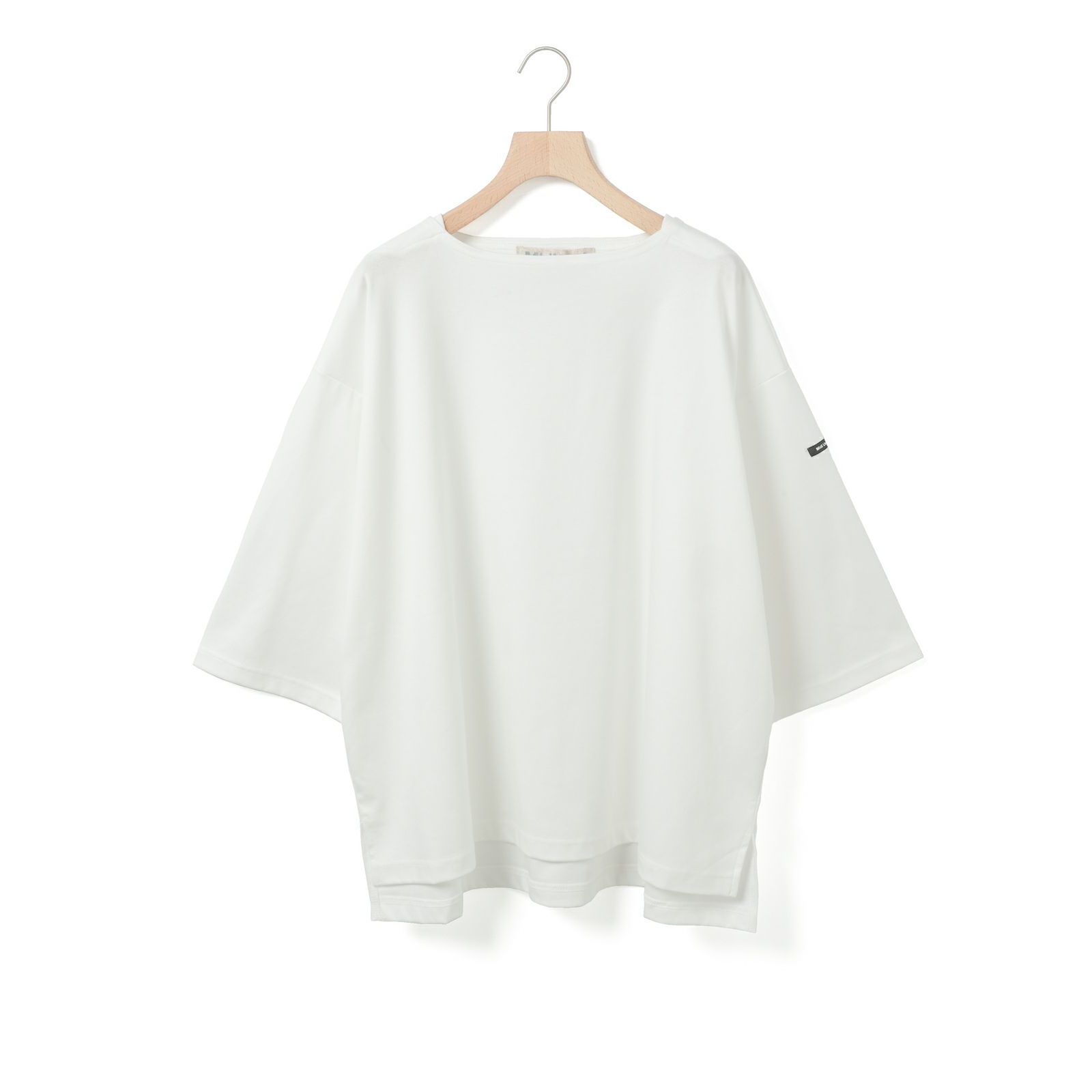 ポンチ素材を使用。白でも透けにくいのが特徴。襟元は布帛でキチンと見えます。ボリューム感のあるボトムとのコーディネートが相性がよく清楚な大人のカジュアルを演出します。裾は若干の前後差が付いています。左袖にブランドネーム付き。