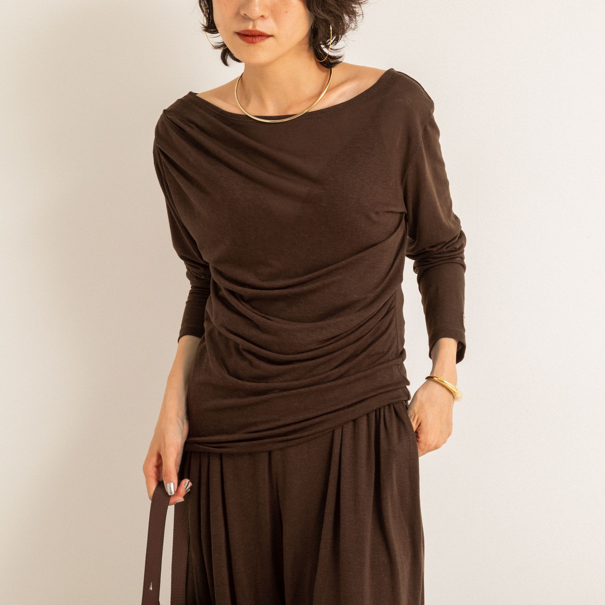 ◇25SS◇MAQWEL【WEB限定】◆Point・ドレープ感のあるデザインが美しいカットソー・右肩と左ウエストにタックを入れることで、1枚でシンプルに着たときにも軽やかで動きのあるこなれた印象に・デコルテをきれいに見せてくれるボートネックデザインもポイント・ウエスト幅を少し絞っているため、出したまま着ても腰周りがすっきり、女性らしいシルエット・ソフトタッチスラブショートT(5-0039-2-03-001)と同素材【MAQWEL(マクウェル)】「日常のなかで力強さとしなやかさを併せ持つ女性のための服」ベースには、洗練されたマニッシュスタイルとヘルシーな着こなしの叶うシンプルなアイテムを。そこにヴィンテージの温かみや、センシュアルなフェミニンさをエッセンスとして加え、いろんな顔を持つ現代女性の気分やシーンに合わせて、その日の自分を自由に表現できる服をお届けします。●お取扱い上のご注意●末永くご愛用頂くために、アテンションタグを必ずご確認の上、着用又はお取り扱い下さい。気になる商品は、お気に入り登録がオススメです!クーポン情報、入荷情報が、通知されるようになります。※手洗い可※店頭及び屋外での撮影画像は、光の当たり具合で色味が違って見える場合があります。商品の色味は、スタジオ撮影の画像をご参照下さい。※商品画像に関しては出来る限り忠実に表示出来るよう努めておりますが、お客様がご利用のモニターの設定及び特性により、実際の商品と比較し色味に若干の誤差が生じる場合があります。※画像の商品はサンプルとなりますので実際の商品と仕様、加工、サイズが若干異なる場合がございます。