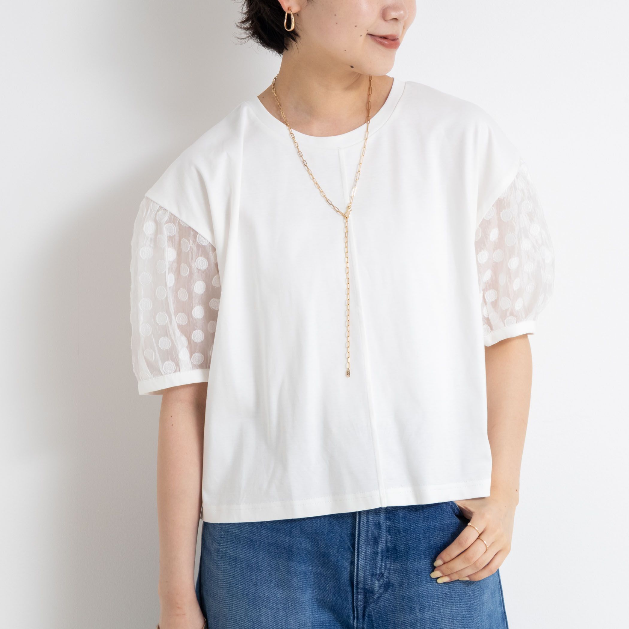 ◇25SS◇NOLLEYS◆Point・袖がシアーなドット柄の上品なパフスリーブカットソー・どの角度から見ても可愛いボリューム袖がポイント・長すぎない着丈で、どんなボトムともバランスが取りやすいのも魅力・デニム合わせもおすすめ・ブラウスより楽で、シンプルなTシャツより華のあるアイテム●お取扱い上のご注意●末永くご愛用頂くために、アテンションタグを必ずご確認の上、着用又はお取り扱い下さい。気になる商品は、お気に入り登録がオススメです!クーポン情報、入荷情報が、通知されるようになります。※手洗い可※店頭及び屋外での撮影画像は、光の当たり具合で色味が違って見える場合があります。商品の色味は、スタジオ撮影の画像をご参照下さい。※商品画像に関しては出来る限り忠実に表示出来るよう努めておりますが、お客様がご利用のモニターの設定及び特性により、実際の商品と比較し色味に若干の誤差が生じる場合があります。※画像の商品はサンプルとなりますので実際の商品と仕様、加工、サイズが若干異なる場合がございます。