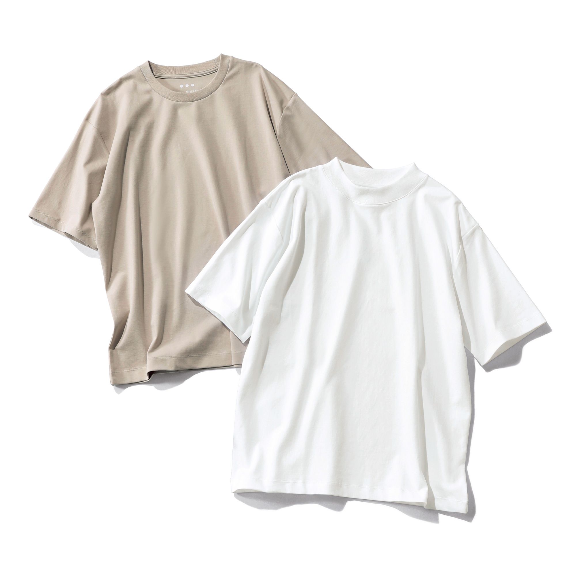パックTシャツはスリードッツのベストセラー。しなやかな高級綿をハイゲージの編み機で編んだ生地は、透けづらく、適度な張りと柔らかな肌ざわりが特徴だ。ホワイトのモックネックとライトグレーのクルーネックの組み合わせは、エクラだけ!