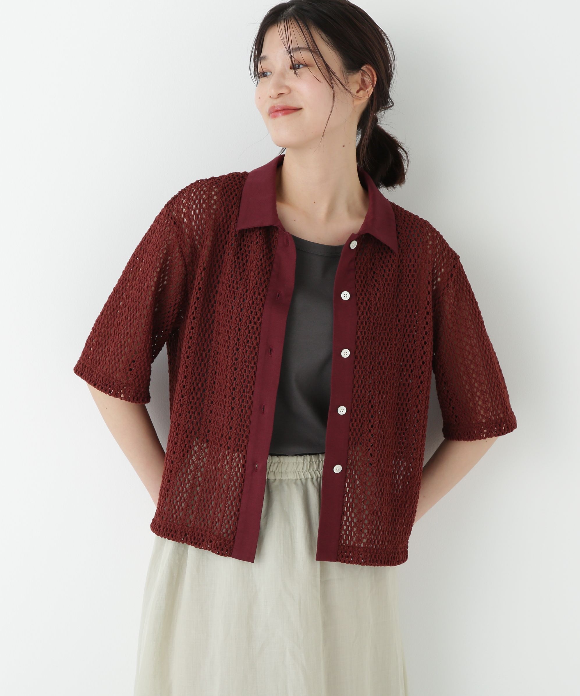 ヘルシーな抜け感が魅力のクロシェ風レースシャツ【デザインのポイント】クロシェ風のレースを使ったシャツ襟付きの羽織り。衿と前立ては天竺カットソーを使用。レースのボリューム感が目を惹くスタイリングのポイント使いになるアイテムです。。【素材のポイント】ザックリとした編地が特徴で透かし柄で涼しげな印象です。見た目に比べて軽く さらっとしたタッチです。衿、前立ては強撚天竺使用、ドライタッチでさらっとしています。【おすすめコーディネート】ノースリーブやキャミソールの上に羽織るだけで抜け感の出るシャツです。一枚着としても、軽い羽織としても活躍します。シワになりにくいので、冷房対策としてバッグに忍ばせておくのもおすすめです。透け感/あり|裏地/なし|光沢/なし|生地の厚さ/普通|伸縮性/ややあり|シルエット/スタンダード