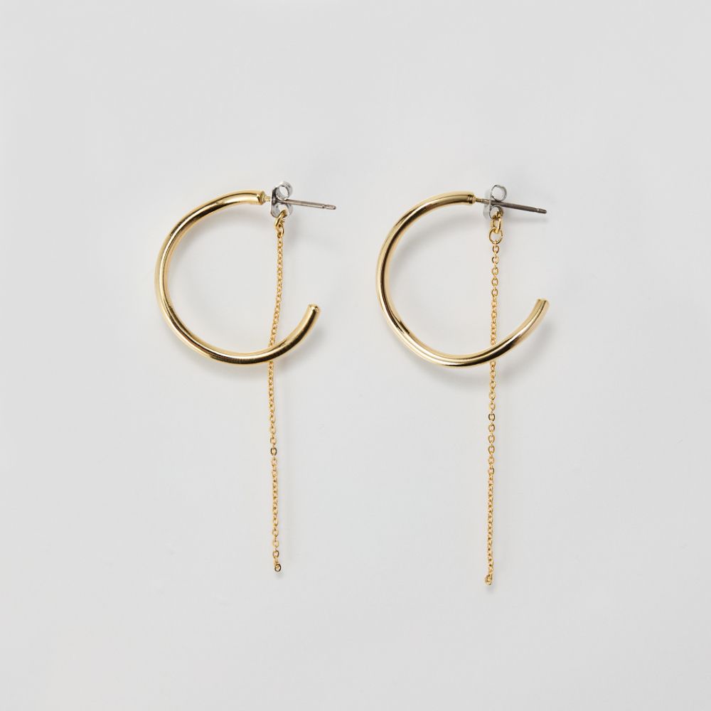 アレルギーが出にくいこだわりのニッケルフリー仕様■サイズ全長:5.5cm,フープ:縦2.7×横2.5cm,開き口:約0.35cm,重さ(片耳):約2g------------------------------------------【都会的なきらめき。気分で変わる2wayスタイル】金線のひねりが繊細なラインを描き、そこに揺れるカットチェーンが上品なきらめきを添える、クラッシーでモードなイヤリング。メタルの質感とチェーンのコントラストが耳元を大人っぽく、洗練された印象に仕上げてくれます。チェーンパーツは金具に引っ掛ける仕様で、簡単に取り外しが可能。シーンや気分に合わせて、チェーン付きで華やかに、チェーンなしでミニマルに、自在に変えて楽しめる2wayデザインです。デイリーにも特別な日にも、自分らしいスタイルに寄り添ってくれるアイテムです。※耳たぶの厚みによっては着用が難しい場合がございます。予めご了承ください。※こちらの商品にはジュエリーBOXは付属しません。〜肌に優しいニッケルフリーメッキ〜金属アレルギーの方にもお楽しみいただけるよう、アレルギーの原因とされるニッケルをほとんど含まずに、メッキ処理を施したアクセサリーです。※必ずしもアレルギー反応が出ないということではございませんので、予めご了承くださいませ。------------------------------------------#オケージョン #結婚式 #普段使い #ギフト#誕生日プレゼント #シンプル #フープイヤリング #金アレ対応------------------------------------------◆◆◆Phoebe/フィービィー◆◆◆欲しいものが必ず見つかる。アクセサリー&ライトジュエリーブランド「Phoebe/フィービィー」▼商品のお気に入り登録ハートマークをクリックし、お気に入りに登録完売商品の再入荷通知や、ラスト1点の通知、セールの通知も受け取ることができます。▼ブランドのお気に入り登録新商品や再入荷等、いち早くブランドのお得な情報を受け取ることができます。