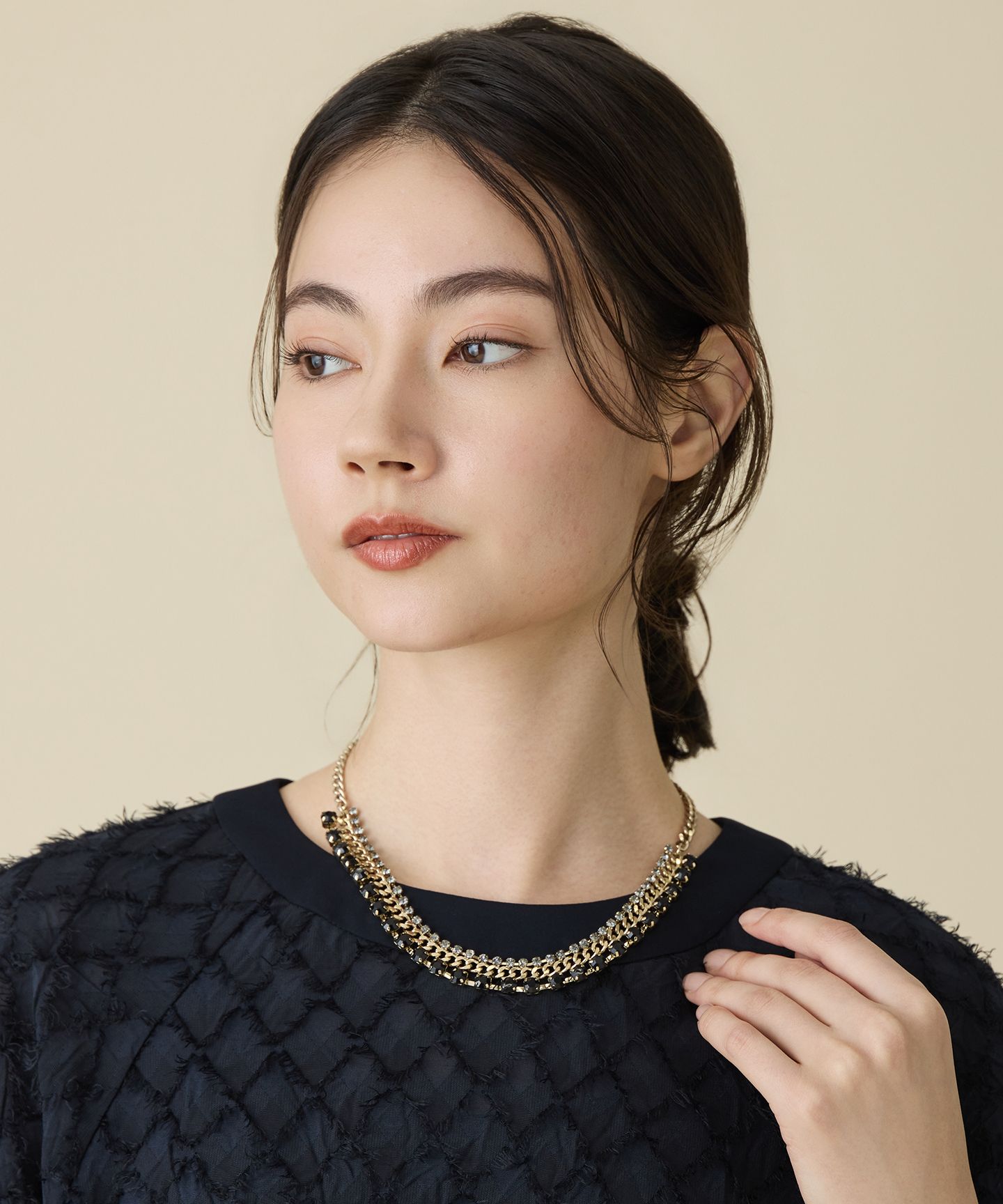 ■デザインデザインの異なる繊細なチェーンを使用した3連のネックレスです。ポイントで天然石を使用したネックレスが2本、石なしのプレーンなチェーンネックレスが1本で、プレーンなチェーンネックレスは外しても使用できる、2WAYデザインです。シンプルなコーディネートにプラスするだけで華やかな印象になります。