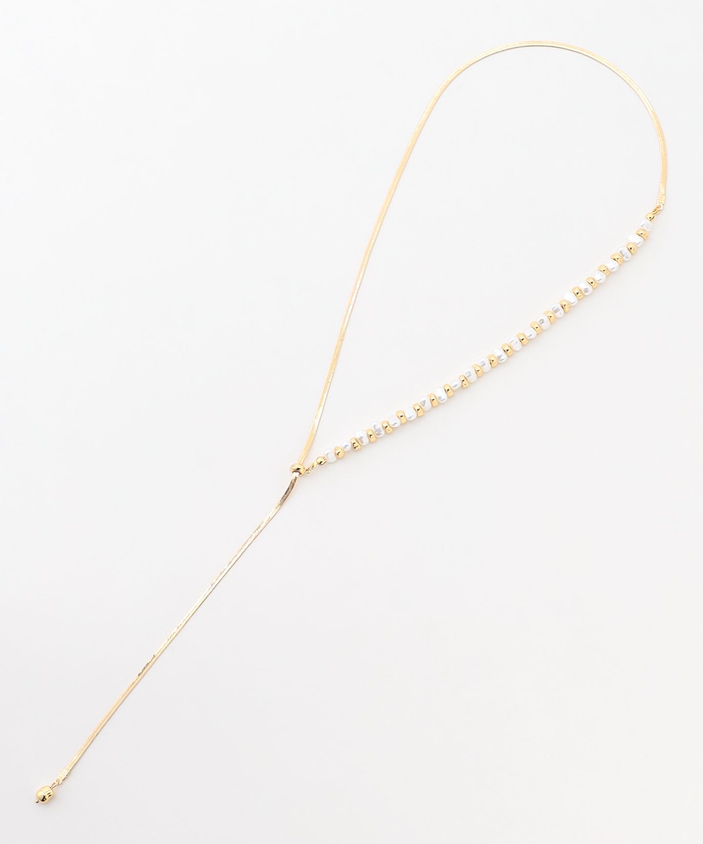 2025AW■デザインスネークチェーンとパールコンビの、トレンド感のあるネックレスです。パールとメタルパールのコンビネーションがポイントになっています。前後2WAYデザインで、様々なコーディネートに合わせていただけます。スライド式のため、かぶりで着けていただくことが可能です。※商品の取り扱い方法につきましては、タグ等に記載されている「取り扱い上の注意」「洗濯表示」をご確認ください。※採寸情報はサンプル商品のデータです。実際の商品と仕様が異なる場合がございます。※商品画像はサンプルを使用しているため、実際にお届けする商品と色味やサイズなどの仕様に変更がある場合がございます。予めご了承ください。