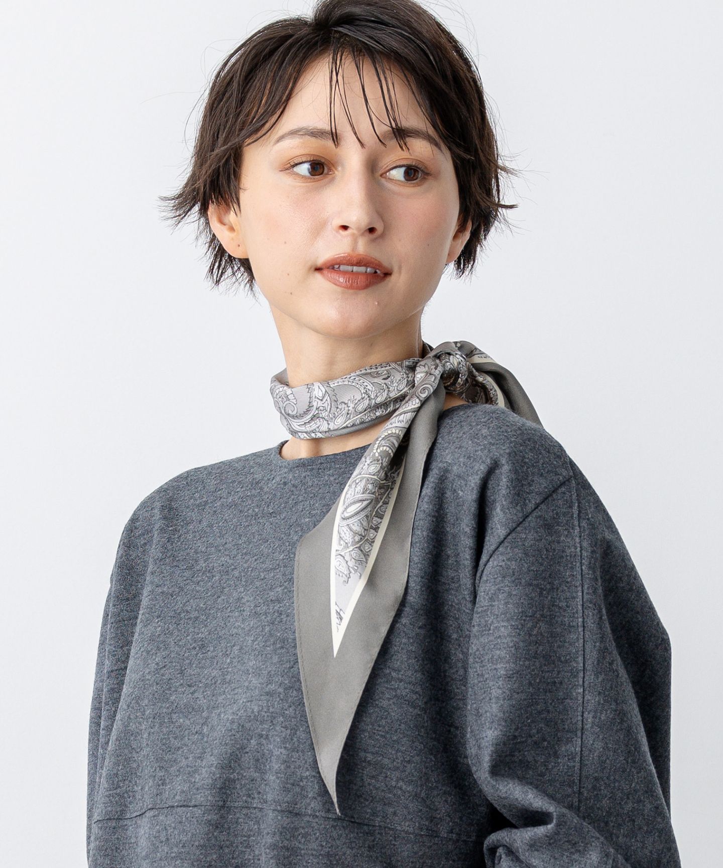2025 Autumn & Winter1点加えるだけで着こなしの鮮度がグッと上がる■デザイン頭や首元に巻いたり、バッグに結んでつけたりと、様々なアレンジをお楽しみいただけます。柔らかい印象の優しいペイズリー柄が女性らしく、スタイリングに華を添えてくれます。ひし形のデザインで巻きやすいのもポイントです。モノトーンでモードにプリントされたライトグレー(#503)と淡いオレンジ寄りの色味のピンクの2色展開です。■素材イタリアのプリントメーカー「Erica」社によるペイズリープリント素材です。エレガントで大胆な柄域のペイズリーは、インドとペルシャ文化の伝統的なモチーフと形状をインスピレーションにしながらも、Ericaならではのモダンで洗練されたタッチが加えられています。老舗プリントメーカーならではの高度なプリント技術により、デザインの複雑なディテールと鮮やかな色合いを繊細に表現した他に類を見ないハイクオリティーな素材です。■同シリーズErica クレープペイズリープリント スカート (品番: SKWOGW0417)※画像はサンプルを使用している為、実際にお届けする商品と仕様が異なる場合がございます。