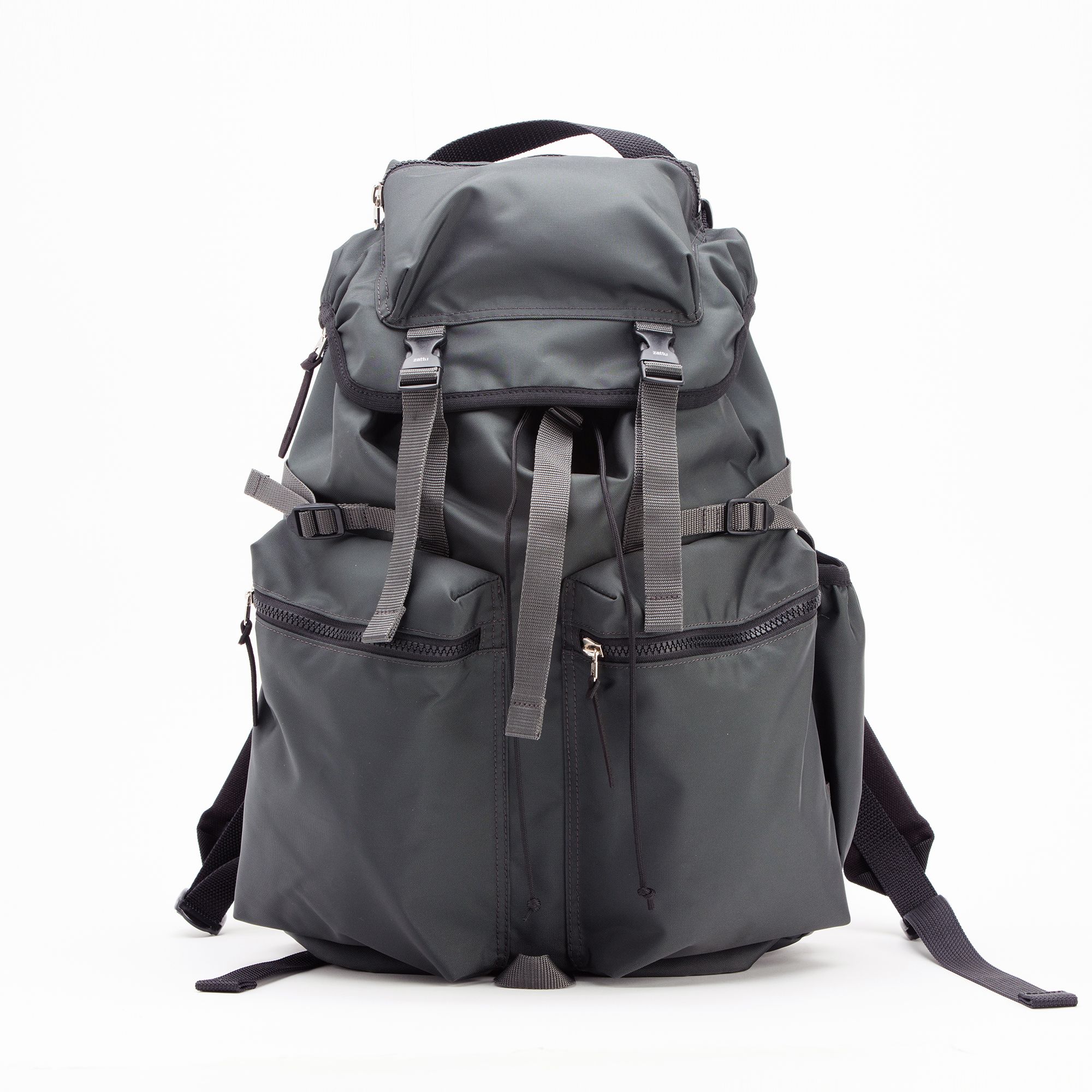 タフで軽量、マット感のあるナイロンを使用し、カラフルなコードで編んだハンドルが特徴的なシングルポケット付き巾着型バッグパック。上部の開閉口に付いた大きなカラビナは、背面のループに通すことでロック機能になります。本体のサイドにあるファスナーから簡単に中のものが取り出せます。