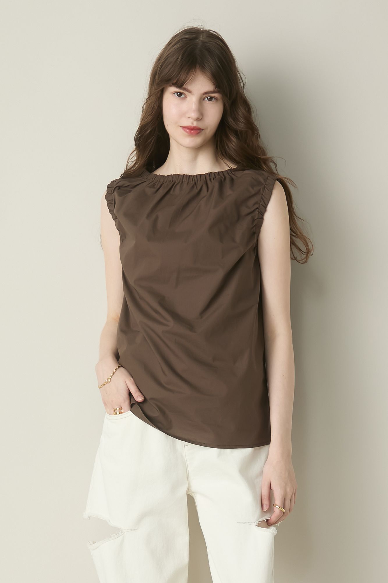 ギャザーを効かせた袖とネックラインが特徴的なノースリーブトップス。ボートネックが抜け感を生み、さりげなく女らしさも補完。100%オーガニックコットンなので肌あたりも良く、同シリーズのパンツとのセットアップも都会的なムードでおすすめです。