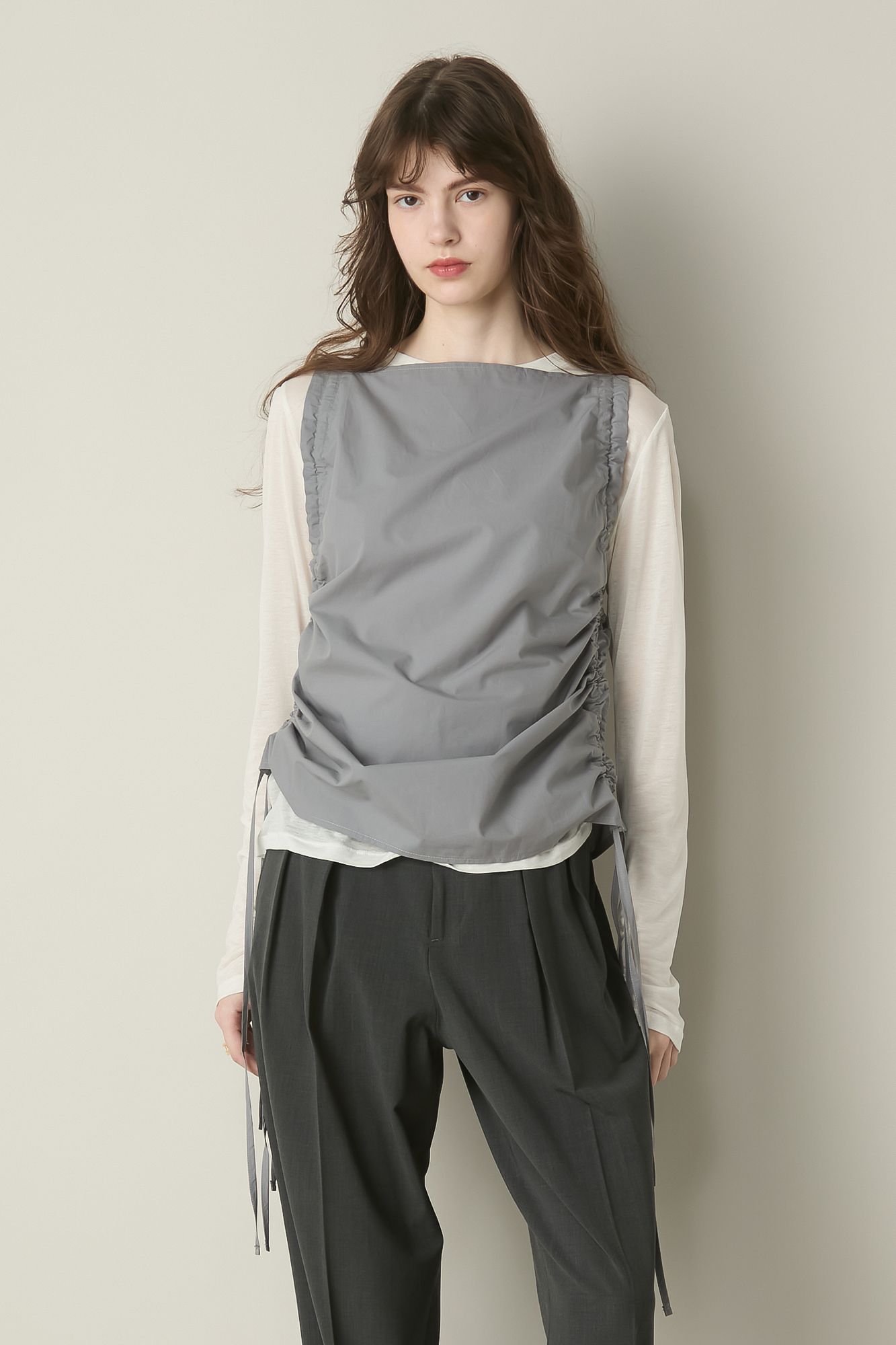 直線的なネックラインが新鮮な、サイドギャザートップス。ギャザー使いや胸元の開きを活かしたレイヤードなど、着こなしアレンジも自在。100%オーガニックコットンで仕上げているので、環境にも配慮しています。